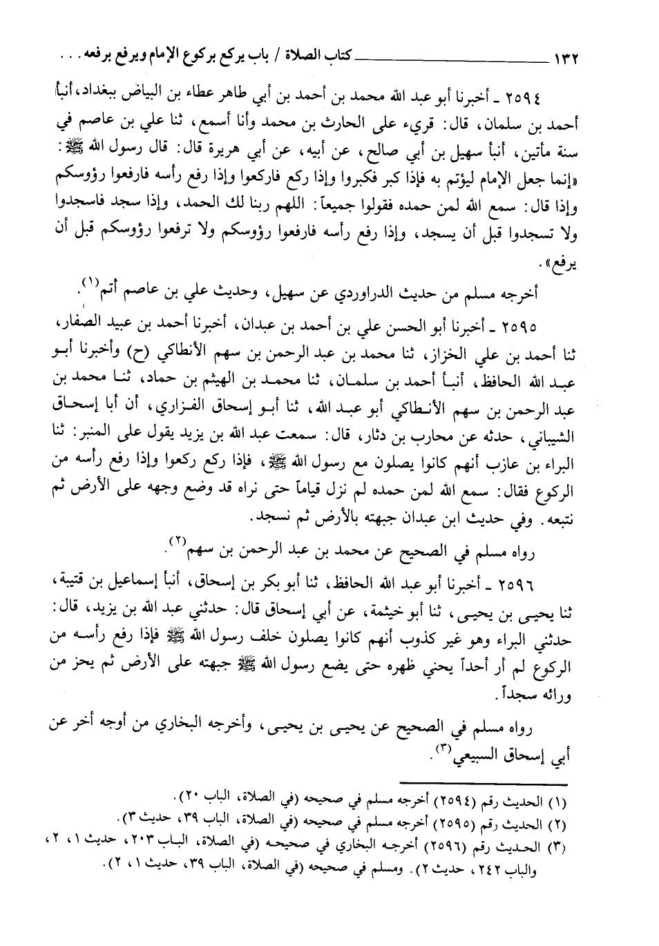2594 - أَخْبَرَنَا أَبُو عَبْدِ اللهِ مُحَمَّدُ بْنُ أَحْمَدَ بْنِ أَبِي طَاهِرٍ عَطَاءُ بْنُ الْبَيَاضِ بِبَغْدَادَ أنبأ أَحْمَدُ بْنُ سَلْمَانَ قَالَ: قُرِئَ عَلَى الْحَارِثِ بْنِ مُحَمَّدٍ وَأنا أَسْمَعُ، ثنا عَلِيُّ بْنُ عَاصِمٍ فِي سَنَةِ مِائَتَيْنِ أنبأ سُهَيْلُ بْنُ أَبِي صَالِحٍ، عَنْ أَبِيهِ، عَنْ أَبِي هُرَيْرَةَ قَالَ: قَالَ رَسُولُ اللهِ صَلَّى اللهُ عَلَيْهِ وَسَلَّمَ: " §إِنَّمَا جُعِلَ الْإِمَامُ لِيُؤْتَمَّ بِهِ فَإِذَا كَبَّرَ فَكَبِّرُوا، وَإِذَا رَكَعَ فَارْكَعُوا، وَإِذَا رَفَعَ رَأْسَهُ فَارْفَعُوا رُءُوسَكُمْ، وَإِذَا قَالَ: سَمِعَ اللهُ لِمَنْ حَمِدَهُ فَقُولُوا جَمِيعًا: اللهُمَّ رَبَّنَا لَكَ الْحَمْدُ، وَإِذَا سَجَدَ فَاسْجُدُوا، وَلَا تَسْجُدُوا قَبْلَ أَنْ يَسْجُدَ، وَإِذَا رَفَعَ رَأْسَهُ فَارْفَعُوا رُءُوسَكُمْ، وَلَا تَرْفَعُوا رُءُوسَكُمْ قَبْلَ أَنْ يَرْفَعَ " أَخْرَجَهُ مُسْلِمٌ مِنْ حَدِيثِ الدَّرَاوَرْدِيِّ، عَنْ سُهَيْلٍ، وَحَدِيثُ عَلِيِّ بْنِ عَاصِمٍ أَتَمُّ