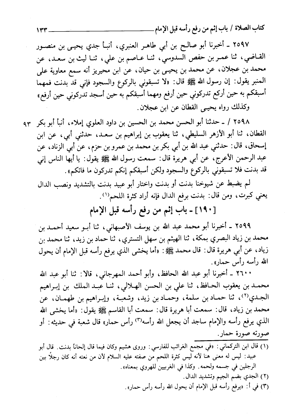2599 - أَخْبَرَنَا أَبُو مُحَمَّدٍ عَبْدُ اللهِ بْنُ يُوسُفَ الْأَصْبَهَانِيُّ، ثنا أَبُو سَعِيدٍ أَحْمَدُ بْنُ مُحَمَّدِ بْنِ زِيَادٍ الْبَصْرِيُّ بِمَكَّةَ، ثنا الْهَيْثَمُ بْنُ سَهْلٍ التُّسْتَرِيُّ، ثنا حَمَّادُ بْنُ زَيْدٍ، ثنا مُحَمَّدُ بْنُ زِيَادٍ، عَنْ أَبِي هُرَيْرَةَ قَالَ: قَالَ مُحَمَّدٌ رَسُولُ اللهِ صَلَّى اللهُ عَلَيْهِ وَسَلَّمَ: §" أَمَا يَخْشَى الَّذِي يَرْفَعُ رَأْسَهُ قَبْلَ الْإِمَامِ أَنْ يَحُوِّلَ اللهُ رَأْسَهُ رَأْسَ حِمَارٍ "