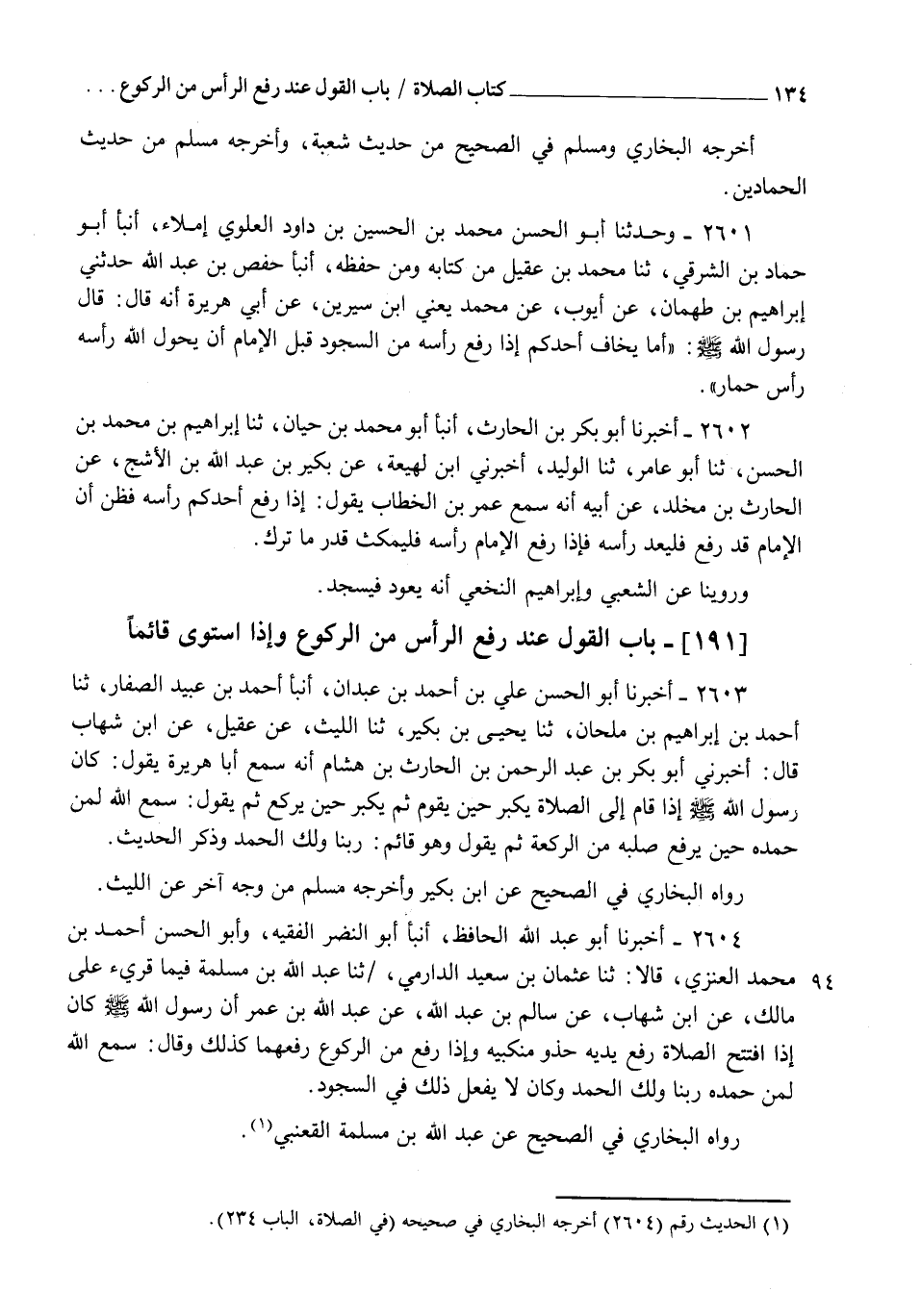 2603 - أَخْبَرَنَا أَبُو الْحَسَنِ عَلِيُّ بْنُ أَحْمَدَ بْنِ عَبْدَانَ، أنبأ أَحْمَدُ بْنُ عُبَيْدٍ الصَّفَّارُ، ثنا أَحْمَدُ بْنُ إِبْرَاهِيمَ بْنِ مِلْحَانَ، ثنا يَحْيَى بْنُ بُكَيْرٍ، ثنا اللَّيْثُ، عَنْ عُقَيْلٍ، عَنِ ابْنِ شِهَابٍ قَالَ: أَخْبَرَنِي أَبُو بَكْرِ بْنُ عَبْدِ الرَّحْمَنِ بْنِ الْحَارِثِ بْنِ هِشَامٍ، أَنَّهُ سَمِعَ أَبَا هُرَيْرَةَ يَقُولُ: كَانَ رَسُولُ اللهِ صَلَّى اللهُ عَلَيْهِ وَسَلَّمَ " §إِذَا قَامَ إِلَى الصَّلَاةِ يُكَبِّرُ حِينَ يَقُومُ، ثُمَّ يُكَبِّرُ حِينَ يَرْكَعُ، ثُمَّ يَقُولُ: سَمِعَ اللهُ لِمَنْ حَمِدَهُ حِينَ يَرْفَعُ صُلْبَهُ مِنَ الرَّكْعَةِ، ثُمَّ يَقُولُ: وَهُوَ قَائِمٌ رَبَّنَا وَلَكَ الْحَمْدُ " وَذَكَرَ الْحَدِيثَ رَوَاهُ الْبُخَارِيُّ فِي الصَّحِيحِ، عَنِ ابْنِ بُكَيْرٍ، وَأَخْرَجَهُ مُسْلِمٌ مِنْ وَجْهٍ آخَرَ، عَنِ اللَّيْثِ