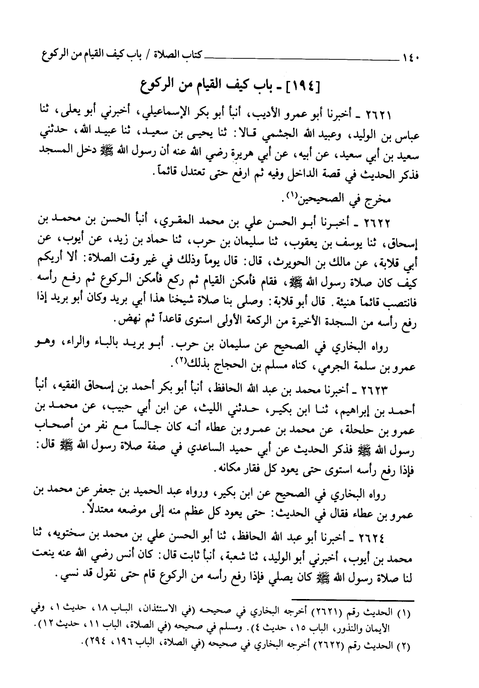 2624 - أَخْبَرَنَا أَبُو عَبْدِ اللهِ الْحَافِظُ، ثنا أَبُو الْحَسَنِ عَلِيُّ بْنُ مُحَمَّدِ بْنِ سَخْتَوَيْهِ، ثنا مُحَمَّدُ بْنُ أَيُّوبَ، أَخْبَرَنِي أَبُو الْوَلِيدِ، ثنا شُعْبَةُ، أنبأ ثَابِتٌ قَالَ: كَانَ أَنَسٌ رَضِيَ اللهُ عَنْهُ يَنْعَتُ لَنَا صَلَاةَ رَسُولِ اللهِ صَلَّى اللهُ عَلَيْهِ وَسَلَّمَ كَانَ يُصَلِّي §" فَإِذَا رَفَعَ رَأْسَهُ مِنَ الرُّكُوعِ قَامَ حَتَّى نَقُولَ قَدْ نَسِيَ " -[141]- رَوَاهُ الْبُخَارِيُّ فِي الصَّحِيحِ، عَنِ أَبِي الْوَلِيدِ