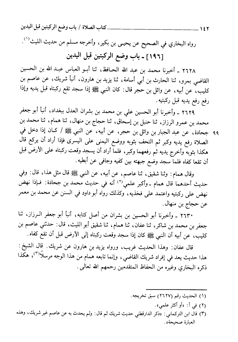 2629 - وَأَخْبَرَنَا أَبُو الْحُسَيْنِ عَلِيُّ بْنُ مُحَمَّدِ بْنِ بِشْرَانَ الْعَدْلُ بِبَغْدَادَ أنبأ أَبُو جَعْفَرٍ مُحَمَّدُ بْنُ عَمْرٍو الرَّزَّازُ، ثنا حَنْبَلُ بْنُ إِسْحَاقَ، ثنا حَجَّاجُ بْنُ مِنْهَالٍ، ثنا هَمَّامٌ، ثنا مُحَمَّدُ بْنُ جُحَادَةَ، عَنْ عَبْدِ الْجَبَّارِ بْنِ وَائِلِ بْنِ حُجْرٍ، عَنْ أَبِيهِ، عَنِ النَّبِيِّ صَلَّى اللهُ عَلَيْهِ وَسَلَّمَ كَانَ " §إِذَا دَخَلَ فِي الصَّلَاةِ رَفَعَ يَدَيْهِ وَكَبَّرَ، ثُمَّ الْتَحَفَ بِثَوْبِهِ وَوَضَعَ الْيُمْنَى عَلَى الْيُسْرَى، فَإِذَا أَرَادَ أَنْ يَرْكَعَ قَالَ هَكَذَا بِثَوْبِهِ، وَأَخْرَجَ يَدَيْهِ، ثُمَّ رَفَعَهُمَا وَكَبَّرَ، فَلَمَّا أَرَادَ أَنْ يَسْجُدَ وَقَعَتْ رُكْبَتَاهُ عَلَى الْأَرْضِ قَبْلَ أَنْ تَقَعَا كَفَّاهُ، فَلَمَّا سَجَدَ وَضَعَ جَبْهَتَهُ بَيْنَ كَفَّيْهِ وَجَافَى عَنْ إِبِطَيْهِ " وَقَالَ هَمَّامٌ: وَثنا شَقِيقٌ، ثنا عَاصِمٌ، عَنْ أَبِيهِ، عَنِ النَّبِيِّ صَلَّى اللهُ عَلَيْهِ وَسَلَّمَ قَالَ مِثْلَ هَذَا قَالَ: وَفِي حَدِيثِ أَحَدِهِمَا قَالَ هَمَّامٌ: وَأَكْبَرُ عِلْمِي أَنَّهُ فِي حَدِيثِ مُحَمَّدِ بْنِ جُحَادَةَ فَإِذَا نَهَضَ نَهَضَ عَلَى رُكْبَتَيْهِ، وَاعْتَمَدَ عَلَى فَخِذَيْهِ، وَكَذَلِكَ رَوَاهُ أَبُو دَاوُدَ فِي السُّنَنِ، عَنْ مُحَمَّدِ بْنِ مَعْمَرٍ، عَنْ حَجَّاجِ بْنِ مِنْهَالٍ