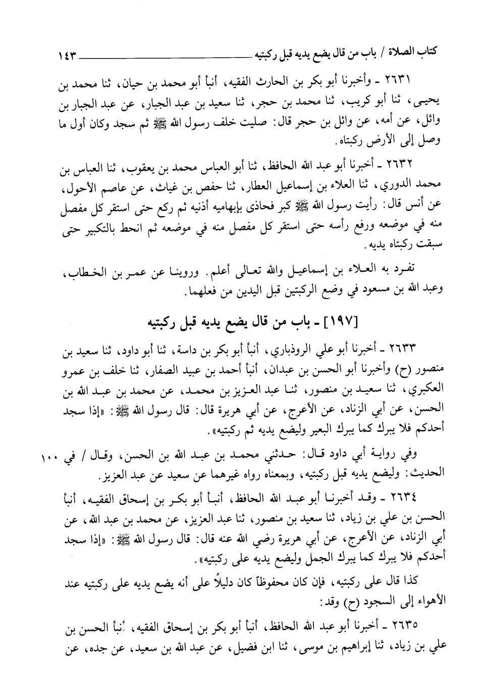 2633 - أَخْبَرَنَا أَبُو عَلِيٍّ الرُّوذْبَارِيُّ، أنبأ أَبُو بَكْرِ بْنُ دَاسَةَ، ثنا أَبُو دَاوُدَ، ثنا سَعِيدُ بْنُ مَنْصُورٍ (ح) وَأَخْبَرَنَا أَبُو الْحَسَنِ بْنُ عَبْدَانَ، أنبأ أَحْمَدُ بْنُ عُبَيْدٍ الصَّفَّارُ، ثنا خَلَفُ بْنُ عَمْرٍو الْعُكْبَرِيُّ، ثنا سَعِيدُ بْنُ مَنْصُورٍ، ثنا عَبْدُ الْعَزِيزِ بْنُ مُحَمَّدٍ، عَنْ مُحَمَّدِ بْنِ عَبْدِ اللهِ بْنِ الْحَسَنِ، عَنْ أَبِي الزِّنَادِ، عَنِ الْأَعْرَجِ، عَنْ أَبِي هُرَيْرَةَ قَالَ: قَالَ رَسُولُ اللهِ صَلَّى اللهُ عَلَيْهِ وَسَلَّمَ: §" إِذَا سَجَدَ أَحَدُكُمْ فَلَا يَبْرُكُ كَمَا يَبْرُكُ الْبَعِيرُ، وَلْيَضَعْ يَدَيْهِ، ثُمَّ رُكْبَتَيْهِ " وَفِي رِوَايَةِ أَبِي دَاوُدَ قَالَ: حَدَّثَنِي مُحَمَّدُ بْنُ عَبْدِ اللهِ بْنِ الْحَسَنِ، وَقَالَ فِي الْحَدِيثِ: " وَلْيَضَعْ يَدَيْهِ قَبْلَ رُكْبَتَيْهِ " وَبِمَعْنَاهُ رَوَاهُ غَيْرُهُمَا، عَنْ سَعِيدِ عَنْ عَبْدِ الْعَزِيزِ