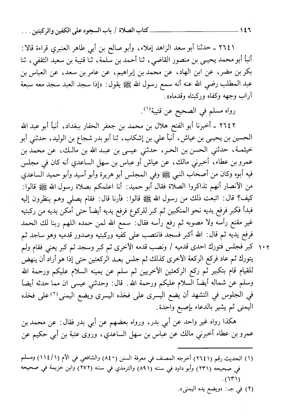 2642 - أَخْبَرَنَا أَبُو الْفَتْحِ هِلَالُ بْنُ مُحَمَّدِ بْنِ جَعْفَرِ الْحَفَّارُ بِبَغْدَادَ، أنبأ أَبُو عَبْدِ اللهِ الْحُسَيْنُ بْنُ يَحْيَى بْنِ عَيَّاشٍ، أنبأ عَلِيُّ بْنُ أَشْكَابَ، ثنا أَبُو بَدْرٍ شُجَاعُ بْنُ الْوَلِيدِ، حَدَّثَنِي أَبُو خَيْثَمَةَ، حَدَّثَنِي الْحَسَنُ بْنُ الْحُرِّ، حَدَّثَنِي عِيسَى بْنُ عَبْدِ اللهِ بْنِ مَالِكٍ، عَنْ مُحَمَّدِ بْنِ عَمْرِو بْنِ عَطَاءٍ، أَخْبَرَنِي مَالِكٌ، عَنْ عَيَّاشٍ أَوْ عَبَّاسِ بْنِ سَهْلٍ السَّاعِدِيِّ أَنَّهُ كَانَ فِي مَجْلِسٍ فِيهِ أَبُوهُ وَكَانَ مِنْ أَصْحَابِ النَّبِيِّ صَلَّى اللهُ عَلَيْهِ وَسَلَّمَ وَفِي الْمَجْلِسِ أَبُو هُرَيْرَةَ، وَأَبُو أُسَيْدٍ وَأَبُو حُمَيْدٍ السَّاعِدِيُّ مِنَ الْأَنْصَارِ أَنَّهُمْ تَذَاكَرُوا الصَّلَاةَ فَقَالَ أَبُو حُمَيْدٍ: أَنَا أَعْلَمُكُمْ بِصَلَاةِ رَسُولِ اللهِ صَلَّى اللهُ عَلَيْهِ وَسَلَّمَ، قَالُوا: كَيْفَ؟ قَالَ: اتَّبَعْتُ ذَلِكَ مِنْ رَسُولِ اللهِ صَلَّى اللهُ عَلَيْهِ وَسَلَّمَ؟ قَالُوا فَأَرِنَا قَالَ: فَقَامَ يُصَلِّي وَهُمْ يَنْظُرُونَ إِلَيْهِ، فَبَدَأَ " §فَكَبَّرَ فَرَفَعَ يَدَيْهِ نَحْوَ الْمَنْكِبَيْنِ، ثُمَّ كَبَّرَ لِلرُّكُوعِ، فَرَفَعَ يَدَيْهِ أَيْضًا حَتَّى أَمْكَنَ يَدَيْهِ مِنْ رُكْبَتَيْهِ غَيْرَ مُقَنَّعٍ رَأْسَهُ وَلَا مُصَوِّبِهِ، ثُمَّ رَفَعَ رَأْسَهُ فَقَالَ: سَمِعَ اللهُ لِمَنْ حَمِدَهُ اللهُمَّ رَبَّنَا لَكَ الْحَمْدُ فَرَفَعَ يَدَيْهِ، ثُمَّ قَالَ: اللهُ أَكْبَرُ فَسَجَدَ فَانْتَصَبَ عَلَى كَفَّيْهِ وَرُكْبَتَيْهِ وَصُدُورِ قَدَمَيْهِ وَهُوَ سَاجِدٌ، ثُمَّ كَبَّرَ فَجَلَسَ فَتَوَرَّكَ إِحْدَى قَدَمَيْهِ وَنَصَبَ قَدَمَهُ الْأُخْرَى، ثُمَّ كَبَّرَ وَسَجَدَ، ثُمَّ كَبَّرَ يَعْنِي فَقَامَ وَلَمْ يَتَوَرَّكْ، ثُمَّ عَادَ فَرَكَعَ الرَّكْعَةَ الْأُخْرَى كَذَلِكَ، ثُمَّ جَلَسَ بَعْدَ الرَّكْعَتَيْنِ حَتَّى إِذَا هُوَ أَرَادَ أَنْ يَنْهَضَ لِلْقِيَامِ قَامَ بِتَكْبِيرٍ، ثُمَّ رَكَعَ الرَّكْعَتَيْنِ الْأُخْرَيَيْنِ، ثُمَّ سَلَّمَ عَنْ يَمِينِهِ، السَّلَامُ عَلَيْكُمْ وَرَحْمَةُ اللهِ، وَسَلَّمَ عَنْ شِمَالِهِ أَيْضًا السَّلَامُ عَلَيْكُمْ وَرَحْمَةُ اللهِ " قَالَ: وَحَدَّثَنِي عِيسَى أَنَّ مِمَّا حَدَّثَهُ أَيْضًا فِي الْجُلُوسِ فِي التَّشَهُّدِ أَنْ يَضَعَ الْيُسْرَى عَلَى فَخِذِهِ الْيُسْرَى وَيَضَعَ الْيُمْنَى عَلَى فَخِذِهِ الْيُمْنَى، ثُمَّ يُشِيرَ بِالدُّعَاءِ بِإِصْبَعٍ وَاحِدَةٍ، هَكَذَا رَوَاهُ غَيْرُ وَاحِدٍ، عَنْ أَبِي بَدْرٍ وَرَوَاهُ بَعْضُهُمْ، عَنْ أَبِي بَدْرٍ، فَقَالَ: عَنْ مُحَمَّدِ بْنِ عَمْرِو بْنِ عَطَاءٍ، أَخْبَرَنِي مَالِكٌ، عَنْ عَبَّاسِ بْنِ سَهْلٍ السَّاعِدِيِّ وَرَوَى عُتْبَةُ بْنُ أَبِي حَكِيمٍ، عَنْ -[147]- عَبْدِ اللهِ بْنِ عِيسَى، عَنِ الْعَبَّاسِ بْنِ سَهْلٍ، عَنْ أَبِي حُمَيْدٍ، وَلَمْ يَذْكُرْ مُحَمَّدًا فِي إِسْنَادِهِ، وَالصَّحِيحُ أَنَّ مُحَمَّدَ بْنَ عَمْرِو بْنِ عَطَاءٍ قَدْ شَهِدَهُ مِنْ أَبِي حُمَيْدٍ السَّاعِدِيِّ