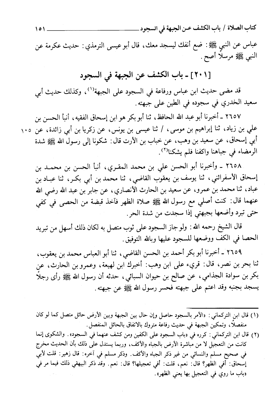 2659 - أَخْبَرَنَا أَبُو بَكْرٍ أَحْمَدُ بْنُ الْحَسَنِ الْقَاضِي، ثنا أَبُو الْعَبَّاسِ مُحَمَّدُ بْنُ يَعْقُوبَ، ثنا بَحْرُ بْنُ نَصْرٍ قَالَ: قُرِئَ عَلَى ابْنِ وَهْبٍ أَخْبَرَكَ ابْنُ لَهِيعَةَ، وَعَمْرُو بْنُ الْحَارِثِ، عَنْ بَكْرِ بْنِ سَوَادَةَ الْجُذَامِيِّ، عَنْ صَالِحِ بْنِ حَيَوَانَ السَّبَائِيِّ حَدَّثَهُ أَنَّ رَسُولَ اللهِ صَلَّى اللهُ عَلَيْهِ وَسَلَّمَ §" رَأَى رَجُلًا يَسْجُدُ بِجَنْبِهِ وَقَدِ اعْتَمَّ عَلَى جَبْهَتِهِ فَحَسَرَ رَسُولُ اللهِ صَلَّى اللهُ عَلَيْهِ وَسَلَّمَ عَنْ جَبْهَتِهِ " -[152]- وَفِيمَا رَوَى مُعَاوِيَةُ بْنُ صَالِحٍ، عَنْ عِيَاضِ بْنِ عَبْدِ اللهِ الْقُرَشِيِّ قَالَ: رَأَى رَسُولُ اللهِ صَلَّى اللهُ عَلَيْهِ وَسَلَّمَ رَجُلًا يَسْجُدُ عَلَى كَوْرِ عِمَامَتِهِ فَأَوْمَأَ بِيَدِهِ ارْفَعْ عِمَامَتَكَ، وَأَوْمَأَ إِلَى جَبْهَتِهِ " وَهَذَا الْمُرْسَلُ شَاهِدٌ لِمُرْسَلٍ صَالِحٍ