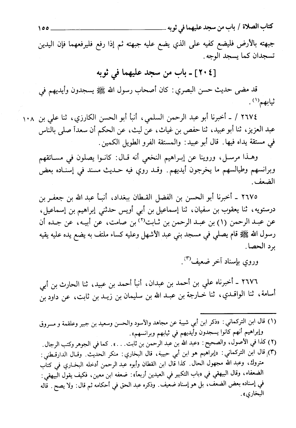 2674 - أَخْبَرَنَا أَبُو عَبْدِ الرَّحْمَنِ السُّلَمِيُّ، أنبأ أَبُو الْحَسَنِ الْكَارِزِيُّ، ثنا عَلِيُّ بْنُ عَبْدِ الْعَزِيزِ، ثنا أَبُو عُبَيْدٍ، ثنا حَفْصُ بْنُ غِيَاثٍ، عَنْ لَيْثٍ، عَنِ الْحَكَمِ، أَنَّ سَعْدًا، §" صَلَّى بِالنَّاسِ فِي مُسْتُقَةٍ يَدَاهُ فِيهَا " قَالَ أَبُو عُبَيْدٍ: وَالْمُسْتُقَةُ: الْفَرْوُ الطَّوِيلُ الْكُمَّيْنِ. وَهَذَا مُرْسَلٌ وَرُوِّينَا عَنْ إِبْرَاهِيمَ النَّخَعِيِّ أَنَّهُ قَالَ: " كَانُوا يُصَلُّونَ فِي مَسَاتِقِهِمْ وَبَرَانِسِهِمْ وَطَيَالِسِهِمْ مَا يُخْرِجُونَ أَيْدِيَهُمْ " وَقَدْ رُوِيَ فِيهِ حَدِيثٌ مُسْنَدٌ، فِي إِسْنَادِهِ بَعْضُ الضَّعْفِ