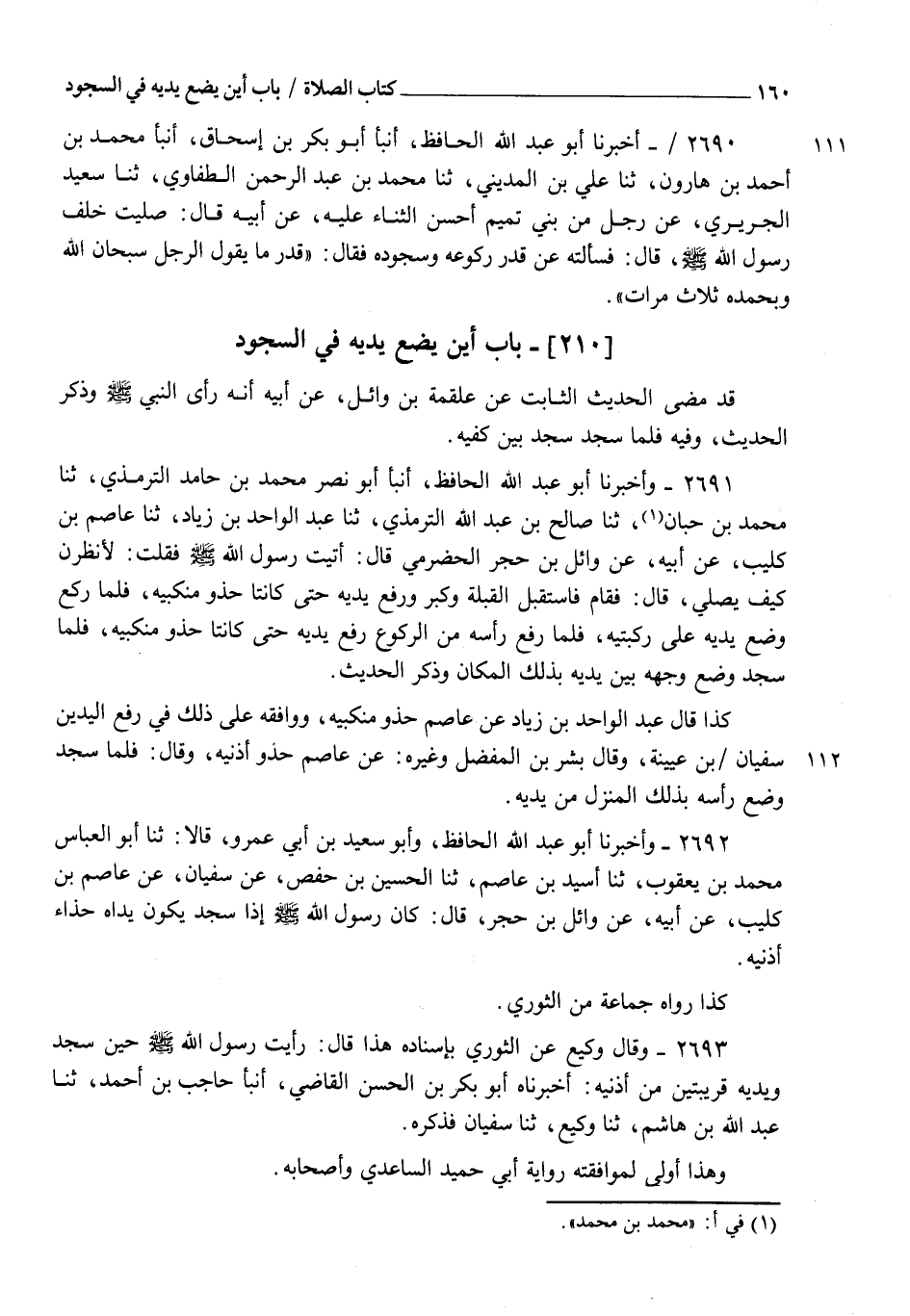 2692 - وَأَخْبَرَنَا أَبُو عَبْدِ اللهِ الْحَافِظُ، وَأَبُو سَعِيدُ بْنُ أَبِي عَمْرٍو قَالَا: ثنا أَبُو الْعَبَّاسِ مُحَمَّدُ بْنُ يَعْقُوبَ، ثنا أُسَيْدُ بْنُ عَاصِمٍ، ثنا الْحُسَيْنُ بْنُ حَفْصٍ، عَنْ سُفْيَانَ، عَنْ عَاصِمِ بْنِ كُلَيْبٍ، عَنْ أَبِيهِ، عَنْ وَائِلِ بْنِ حُجْرٍ قَالَ: كَانَ رَسُولُ اللهِ صَلَّى اللهُ عَلَيْهِ وَسَلَّمَ §" إِذَا سَجَدَ يَكُونُ يَدَاهُ حِذَاءَ أُذُنَيْهِ " كَذَا رَوَاهُ جَمَاعَةٌ، عَنِ الثَّوْرِيِّ