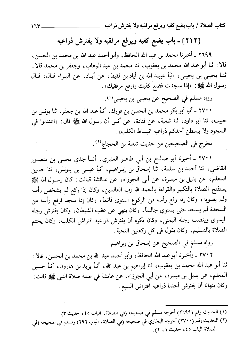 2702 - وَأَخْبَرَنَا أَبُو عَبْدِ اللهِ الْحَافِظُ، وَأَبُو أَحْمَدَ عَبْدُ اللهِ بْنُ مُحَمَّدِ بْنِ الْحَسَنِ قَالَا: ثنا أَبُو عَبْدِ اللهِ مُحَمَّدُ بْنُ يَعْقُوبَ، ثنا إِبْرَاهِيمُ بْنُ عَبْدِ اللهِ، أنبأ يَزِيدُ بْنُ هَارُونَ، أنبأ حُسَيْنٌ الْمُعَلِّمُ، عَنْ بُدَيْلِ بْنِ مَيْسَرَةَ، عَنْ أَبِي الْجَوْزَاءِ، عَنْ عَائِشَةَ، فِي صِفَةِ صَلَاةِ النَّبِيِّ صَلَّى اللهُ عَلَيْهِ وَسَلَّمَ قَالَتْ: وَكَانَ §" يَنْهَانَا أَنْ يَفْتَرِشَ أَحَدُنَا ذِرَاعَيْهِ افْتِرَاشَ السَّبُعِ " -[164]- وَرُوِّينَا فِيهِ عَنْ جَابِرِ بْنِ عَبْدِ اللهِ، وَأَبِي هُرَيْرَةَ، وَعَبْدِ الرَّحْمَنِ بْنِ شِبْلٍ، عَنِ النَّبِيِّ صَلَّى اللهُ عَلَيْهِ وَسَلَّمَ