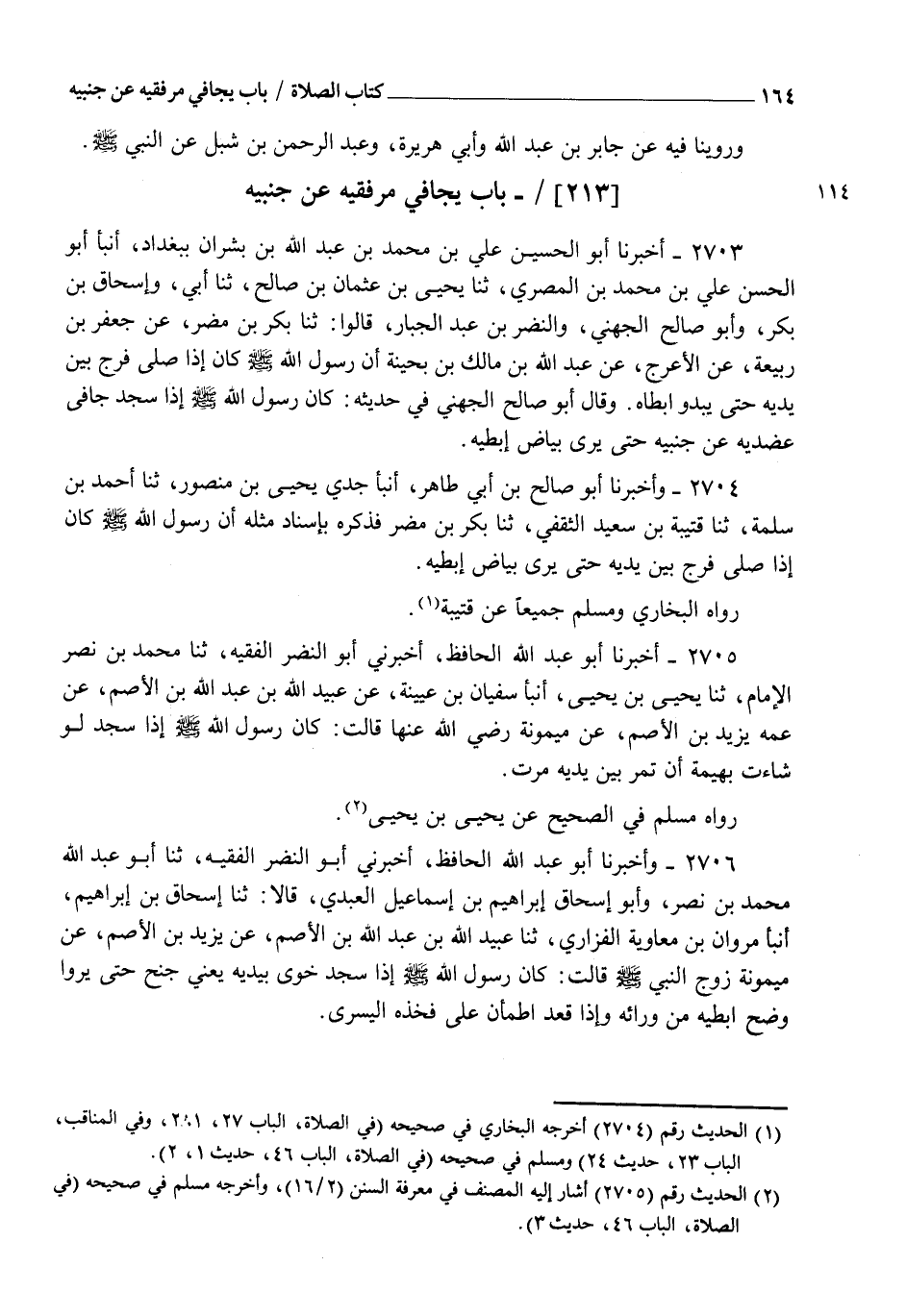2704 - وَأَخْبَرَنَا أَبُو صَالِحِ بْنُ أَبِي طَاهِرٍ، أنبأ جَدِّي يَحْيَى بْنُ مَنْصُورٍ، ثنا أَحْمَدُ بْنُ سَلَمَةَ، ثنا قُتَيْبَةُ بْنُ سَعِيدٍ الثَّقَفِيُّ، ثنا بَكْرُ بْنُ مُضَرَ، فَذَكَرَهُ بِإِسْنَادٍ مِثْلِهِ أَنَّ رَسُولَ اللهِ صَلَّى اللهُ عَلَيْهِ وَسَلَّمَ كَانَ §" إِذَا صَلَّى فَرَّجَ بَيْنَ يَدَيْهِ حَتَّى يُرَى بَيَاضُ إِبِطَيْهِ " رَوَاهُ الْبُخَارِيُّ وَمُسْلِمٌ جَمِيعًا عَنْ قُتَيْبَةَ