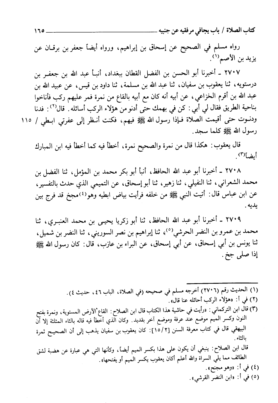 2707 - أَخْبَرَنَا أَبُو الْحُسَيْنِ بْنُ الْفَضْلِ الْقَطَّانُ بِبَغْدَادَ، أنبأ عَبْدُ اللهِ بْنُ جَعْفَرِ بْنِ دَرَسْتَوَيْهِ، ثنا يَعْقُوبُ بْنُ سُفْيَانَ، ثنا عَبْدُ اللهِ بْنُ مَسْلَمَةَ، ثنا دَاوُدُ بْنُ قَيْسٍ، عَنْ عُبَيْدِ اللهِ بْنِ عَبْدِ اللهِ بْنِ أَقْرَمَ الْخُزَاعِيِّ، عَنْ أَبِيهِ، أَنَّهُ كَانَ مَعَ أَبِيهِ بِالْقَاعِ مِنْ نَمِرَةَ، فَمَرَّ عَلَيْهِمْ رَكْبٌ فَأَنَاخُوا بِنَاحِيَةِ الطَّرِيقِ، فَقَالَ لِي أَبِي: كُنْ فِي بَهْمِكَ حَتَّى أَدْنُوَ مِنْ هَؤُلَاءِ الرَّكْبِ أُسَائِلُهُ قَالَ: §" فَدَنَا وَدَنَوْتُ حَتَّى أُقِيمَتِ الصَّلَاةُ فَإِذَا رَسُولُ اللهِ صَلَّى اللهُ عَلَيْهِ وَسَلَّمَ فِيهِمْ فَكُنْتُ أَنْظُرُ إِلَى عُفْرَتَيْ إِبِطَيْ رَسُولِ اللهِ صَلَّى اللهُ عَلَيْهِ وَسَلَّمَ كُلَّمَا سَجَدَ " قَالَ يَعْقُوبُ هَكَذَا قَالَ: مِنْ نَمِرَةَ، وَالصَّحِيحُ ثَمِرَةُ، أَخْطَأَ فِيهِ كَمَا أَخْطَأَ فِيهِ ابْنُ الْمُبَارَكِ أَيْضًا
