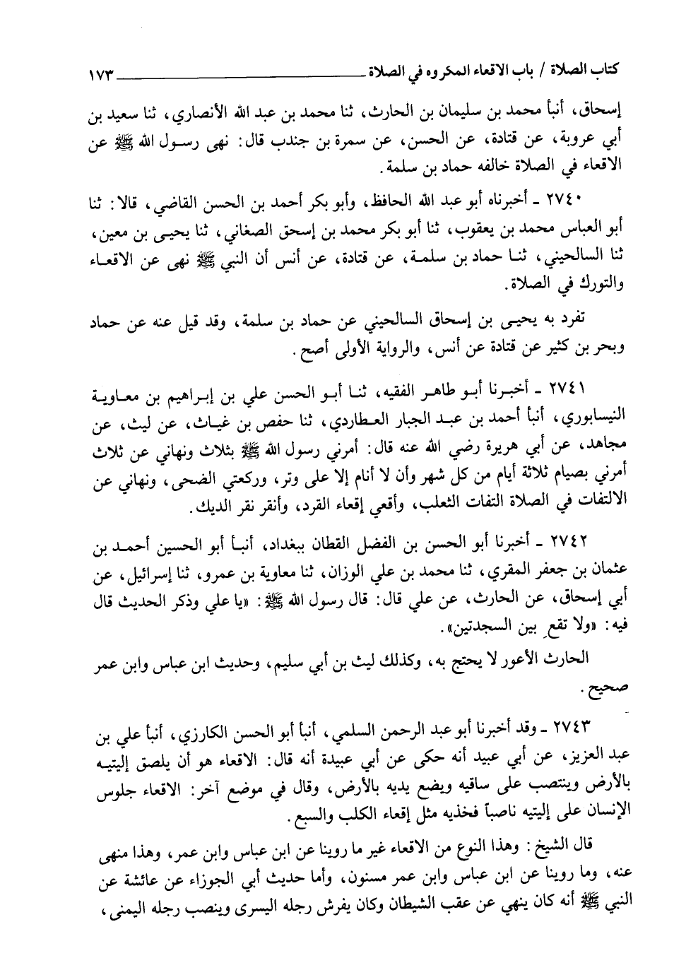 2740 - أَخْبَرَنَاهُ أَبُو عَبْدِ اللهِ الْحَافِظُ، وَأَبُو بَكْرٍ أَحْمَدُ بْنُ الْحَسَنِ الْقَاضِي قَالَا: ثنا أَبُو الْعَبَّاسِ مُحَمَّدُ بْنُ يَعْقُوبَ، ثنا أَبُو بَكْرٍ مُحَمَّدُ بْنُ إِسْحَاقَ الصَّغَانِيُّ، ثنا يَحْيَى بْنُ مَعِينٍ، ثنا السَّالَحِينِيُّ، ثنا حَمَّادُ بْنُ سَلَمَةَ، عَنْ قَتَادَةَ، عَنْ أَنَسٍ، أَنَّ النَّبِيَّ صَلَّى اللهُ عَلَيْهِ وَسَلَّمَ §" نَهَى عَنِ الْإِقْعَاءِ وَالتَّوَرُّكِ فِي الصَّلَاةِ " تَفَرَّدَ بِهِ يَحْيَى بْنُ إِسْحَاقَ السَّيْلَحِينِيُّ، عَنْ حَمَّادِ بْنِ سَلَمَةَ، وَقَدْ قِيلَ: عَنْهُ، عَنْ حَمَّادٍ، وَبَحْرِ بْنِ كَثِيرٍ، عَنْ قَتَادَةَ، عَنْ أَنَسٍ، وَالرِّوَايَةُ الْأُولَى أَصَحُّ