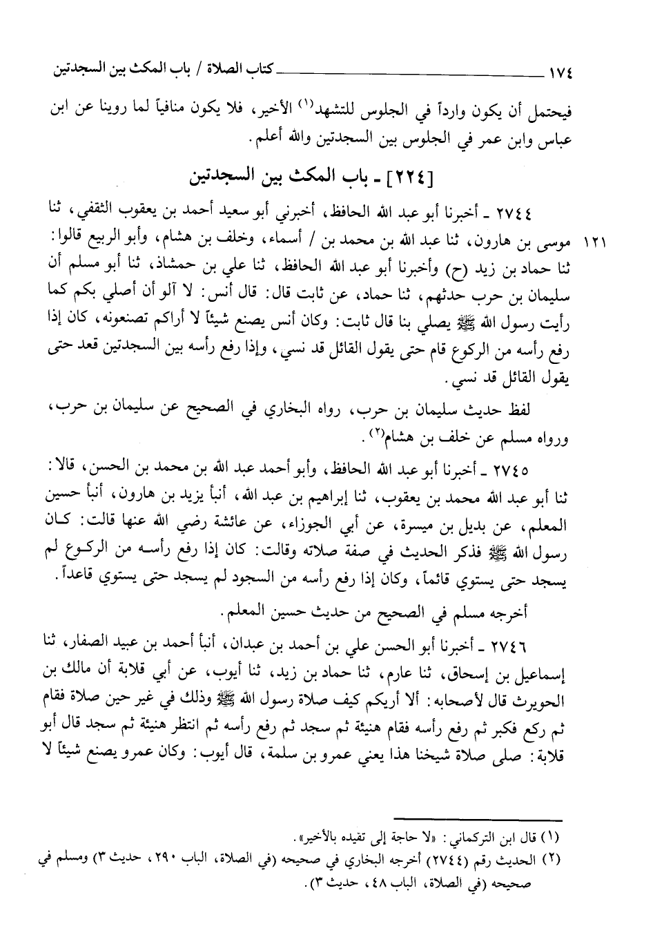 2744 - أَخْبَرَنَا أَبُو عَبْدِ اللهِ الْحَافِظُ، أَخْبَرَنِي أَبُو سَعِيدٍ أَحْمَدُ بْنُ يَعْقُوبَ الثَّقَفِيُّ، ثنا مُوسَى بْنُ هَارُونَ، ثنا عَبْدُ اللهِ بْنُ مُحَمَّدِ بْنِ أَسْمَاءٍ، وَخَلَفُ بْنُ هِشَامٍ، وَأَبُو الرَّبِيعِ قَالُوا: ثنا حَمَّادُ بْنُ زَيْدٍ (ح) وَأَخْبَرَنَا أَبُو عَبْدِ اللهِ الْحَافِظُ، ثنا عَلِيُّ بْنُ حِمْشَاذَ، ثنا أَبُو مُسْلِمٍ أَنَّ سُلَيْمَانَ بْنَ حَرْبٍ، حَدَّثَهُمْ، ثنا حَمَّادٌ، عَنْ ثَابِتٍ قَالَ: قَالَ أَنَسٌ: " لَا آلُو أَنْ أُصَلِّيَ بِكُمْ كَمَا رَأَيْتُ رَسُولَ اللهِ صَلَّى اللهُ عَلَيْهِ وَسَلَّمَ يُصَلِّي بِنَا قَالَ ثَابِتٌ: وَكَانَ أَنَسٌ يَصْنَعُ شَيْئًا لَا أَرَاكُمْ تَصْنَعُونَهُ، كَانَ §إِذَا رَفَعَ رَأْسَهُ مِنَ الرُّكُوعِ قَامَ حَتَّى يَقُولَ الْقَائِلُ قَدْ نَسِيَ، وَإِذَا رَفَعَ رَأْسَهُ بَيْنَ السَّجْدَتَيْنِ قَعَدَ حَتَّى يَقُولَ الْقَائِلُ: قَدْ نَسِيَ " لَفْظُ حَدِيثِ سُلَيْمَانَ بْنِ حَرْبٍ، رَوَاهُ الْبُخَارِيُّ فِي الصَّحِيحِ، عَنْ سُلَيْمَانَ بْنِ حَرْبٍ، وَرَوَاهُ مُسْلِمٌ، عَنْ خَلَفِ بْنِ هِشَامٍ