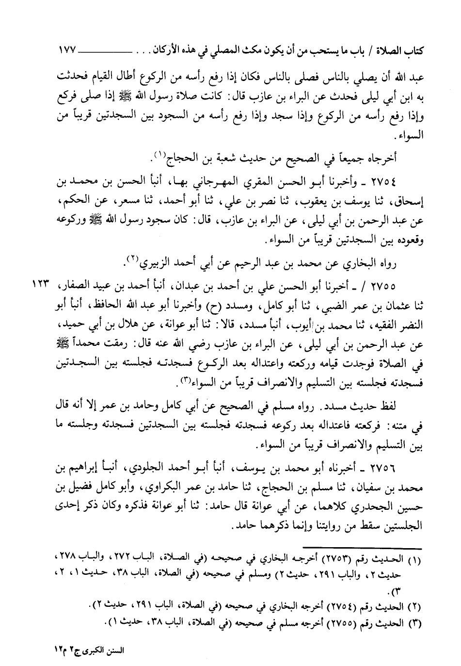 2754 - وَأَخْبَرَنَا أَبُو الْحَسَنِ الْمُقْرِئُ الْمِهْرَجَانِيُّ بِهَا أنبأ الْحَسَنُ بْنُ مُحَمَّدِ بْنِ إِسْحَاقَ، ثنا يُوسُفُ بْنُ يَعْقُوبَ، ثنا نَصْرُ بْنُ عَلِيٍّ، ثنا أَبُو أَحْمَدَ، ثنا مِسْعَرٌ، عَنِ الْحَكَمِ، عَنْ عَبْدِ الرَّحْمَنِ بْنِ أَبِي لَيْلَى، عَنِ الْبَرَاءِ بْنِ عَازِبٍ قَالَ: §" كَانَ سُجُودُ رَسُولِ اللهِ صَلَّى اللهُ عَلَيْهِ وَسَلَّمَ وَرُكُوعُهُ وَقُعُودُهُ بَيْنَ السَّجْدَتَيْنِ قَرِيبًا مِنَ السَّوَاءِ " رَوَاهُ الْبُخَارِيُّ، عَنْ مُحَمَّدِ بْنِ عَبْدِ الرَّحِيمِ، عَنْ أَبِي أَحْمَدَ الزُّبَيْرِيِّ