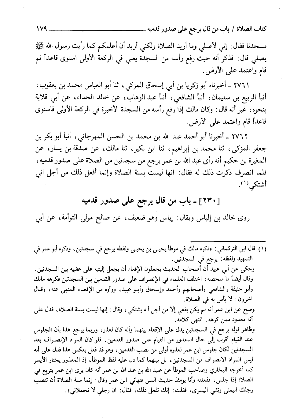 2762 - أَخْبَرَنَا أَبُو أَحْمَدَ عَبْدُ اللهِ بْنُ مُحَمَّدِ بْنِ الْحَسَنِ الْمِهْرَجَانِيُّ، أنبأ أَبُو بَكْرِ بْنُ جَعْفَرٍ الْمُزَكِّي، ثنا مُحَمَّدُ بْنُ إِبْرَاهِيمَ، ثنا ابْنُ بُكَيْرٍ، ثنا مَالِكٌ، عَنْ صَدَقَةَ بْنِ يَسَارٍ، عَنِ الْمُغِيرَةِ بْنِ حَكِيمٍ، أَنَّهُ رَأَى عَبْدَ اللهِ بْنَ عُمَرَ يَرْجِعُ مِنْ سَجْدَتَيْنِ مِنَ الصَّلَاةِ عَلَى صُدُورِ قَدَمَيْهِ، فَلَمَّا انْصَرَفَ ذَكَرْتُ ذَلِكَ لَهُ، فَقَالَ: " إِنَّهَا §لَيْسَتْ بِسُنَّةِ الصَّلَاةِ وَإِنَّمَا أَفْعَلُ ذَلِكَ مِنْ أَجْلِ أَنِّي أَشْتَكِي "