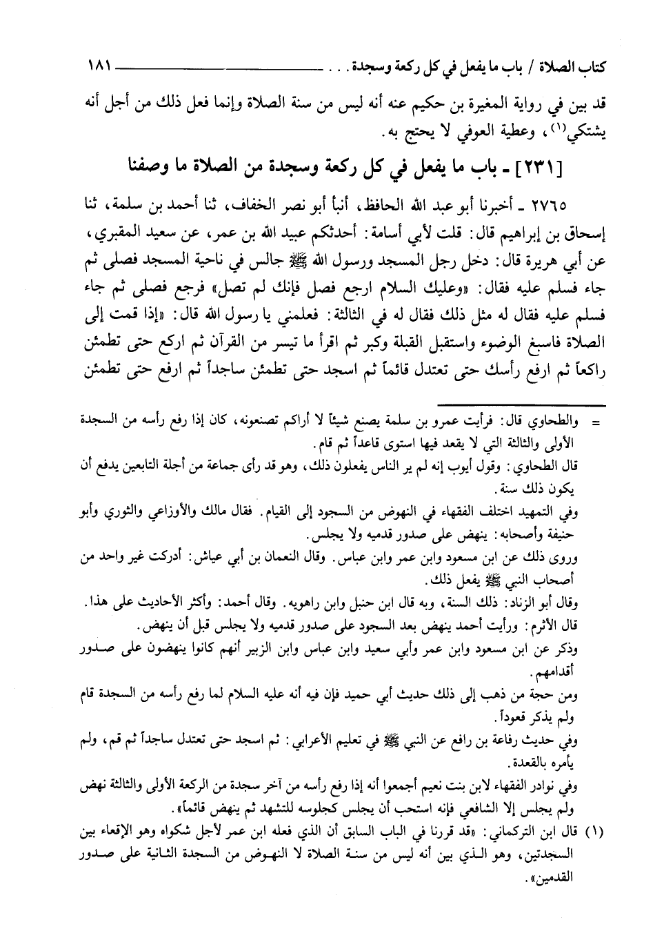 2765 - أَخْبَرَنَا أَبُو عَبْدِ اللهِ الْحَافِظُ، أنبأ أَبُو نَصْرٍ الْخَفَّافُ، ثنا أَحْمَدُ بْنُ سَلَمَةَ، ثنا إِسْحَاقُ بْنُ إِبْرَاهِيمَ قَالَ: قُلْتُ لِأَبِي أُسَامَةَ، أَحَدَّثَكُمْ عُبَيْدُ اللهِ بْنُ عُمَرَ، عَنْ سَعِيدٍ الْمَقْبُرِيِّ، عَنْ أَبِي هُرَيْرَةَ قَالَ: دَخَلَ رَجُلٌ الْمَسْجِدَ وَرَسُولُ اللهِ صَلَّى اللهُ عَلَيْهِ وَسَلَّمَ جَالِسٌ فِي نَاحِيَةِ الْمَسْجِدِ فَصَلَّى، ثُمَّ جَاءَ فَسَلَّمَ عَلَيْهِ، فَقَالَ: " وَعَلَيْكَ السَّلَامُ، ارْجِعْ فَصَلِّ فَإِنَّكَ لَمْ تُصَلِّ " فَرَجَعَ فَصَلَّى، ثُمَّ جَاءَ فَسَلَّمَ عَلَيْهِ، فَقَالَ لَهُ مِثْلَ ذَلِكَ، فَقَالَ لَهُ فِي الثَّالِثَةِ: فَعَلِّمْنِي يَا رَسُولَ اللهِ، قَالَ: " §إِذَا قُمْتَ إِلَى الصَّلَاةِ فَأَسْبِغِ الْوُضُوءَ وَاسْتَقْبِلِ الْقِبْلَةَ وَكَبِّرْ، ثُمَّ اقْرَأْ مَا تَيَسَّرَ مِنَ الْقُرْآنِ، ثُمَّ ارْكَعْ حَتَّى تَطْمَئِنَّ رَاكِعًا، ثُمَّ ارْفَعْ رَأْسَكَ حَتَّى تَعْتَدِلَ قَائِمًا، ثُمَّ اسْجُدْ حَتَّى تَطْمَئِنَّ سَاجِدًا، ثُمَّ ارْفَعْ حَتَّى تَطْمَئِنَّ -[182]- قَاعِدًا، ثُمَّ اسْجُدْ حَتَّى تَطْمَئِنَّ سَاجِدًا، ثُمَّ اقْعُدْ حَتَّى تَطْمَئِنَّ قَاعِدًا، ثُمَّ افْعَلْ كَذَلِكَ فِي كُلِّ رَكْعَةٍ وَسَجْدَةٍ " فَأَقَرَّ بِهِ أَبُو أُسَامَةَ وَقَالَ: نَعَمْ كَذَا قَالَ إِسْحَاقُ بْنُ إِبْرَاهِيمَ الْحَنْظَلِيُّ، عَنْ أَبِي أُسَامَةَ وَرِوَايَتُهُ كَذَلِكَ مِنْ وَجْهٍ آخَرَ، عَنْ أَبِي أُسَامَةَ وَمِنْ وَجْهٍ آخَرَ، عَنِ ابْنِ نُمَيْرٍ