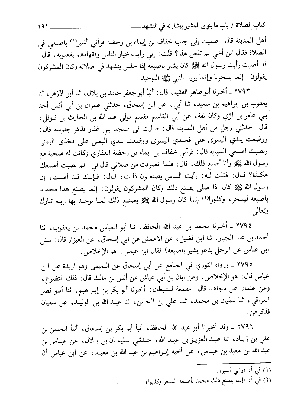 2793 - أَخْبَرَنَا أَبُو طَاهِرٍ الْفَقِيهُ قَالَ: أنبأ أَبُو جَعْفَرٍ حَامِدُ بْنُ بِلَالٍ، ثنا أَبُو الْأَزْهَرِ، ثنا يَعْقُوبُ بْنُ إِبْرَاهِيمَ بْنِ سَعِيدٍ، ثنا أَبِي، عَنِ ابْنِ إِسْحَاقَ، حَدَّثَنِي عِمْرَانُ بْنُ أَبِي أَنَسٍ أَحَدُ بَنِي عَامِرِ بْنِ لُؤَيٍّ وَكَانَ ثِقَةً، عَنْ أَبِي الْقَاسِمِ مِقْسَمٍ مَوْلَى عَبْدِ اللهِ بْنِ الْحَارِثِ بْنِ نَوْفَلٍ قَالَ: حَدَّثَنِي رَجُلٌ مِنْ أَهْلِ الْمَدِينَةِ قَالَ: صَلَّيْتُ فِي مَسْجِدِ بَنِي غِفَارٍ فَذَكَرَ جُلُوسَهُ قَالَ: " §وَوَضَعْتُ يَدِي الْيُسْرَى عَلَى فَخِذِي الْيُسْرَى، وَوَضَعْتُ يَدِي الْيُمْنَى عَلَى فَخِذِي الْيُمْنَى، وَنَصَبْتُ أُصْبُعِي السَّبَابَةَ قَالَ: فَرَآنِي خُفَافُ بْنُ إِيمَاءِ بْنِ رَحَضَةَ الْغِفَارِيُّ وَكَانَتْ لَهُ صُحْبَةٌ مَعَ رَسُولِ اللهِ صَلَّى اللهُ عَلَيْهِ وَسَلَّمَ، وَأَنَا أَصْنَعُ ذَلِكَ قَالَ: فَلَمَّا انْصَرَفْتُ مِنْ صَلَاتِي قَالَ لِي: لِمَ نَصَبْتَ إِصْبَعِكَ هَكَذَا؟ قَالَ: فَقُلْتُ لَهُ: رَأَيْتُ النَّاسَ يَصْنَعُونَ ذَلِكَ قَالَ: فَإِنَّكَ قَدْ أَصَبْتَ، إِنَّ رَسُولَ اللهِ صَلَّى اللهُ عَلَيْهِ وَسَلَّمَ كَانَ " إِذَا صَلَّى يَصْنَعُ ذَلِكَ " وَكَانَ الْمُشْرِكُونَ يَقُولُونَ: " إِنَّمَا يَصْنَعُ هَذَا مُحَمَّدٌ بِأُصْبُعِهِ لِيَسْحَرَ، وَكَذَبُوا " إِنَّمَا كَانَ رَسُولُ اللهِ صَلَّى اللهُ عَلَيْهِ وَسَلَّمَ يَصْنَعُ ذَلِكَ؛ لِمَا يُوَحِّدُ بِهَا رَبَّهُ تَبَارَكَ وَتَعَالَى "