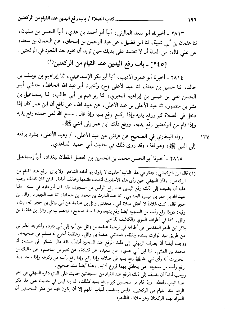 2814 - أَخْبَرَنَا أَبُو عَمْرٍو الْأَدِيبُ، أنبأ أَبُو بَكْرٍ الْإِسْمَاعِيلِيُّ، ثنا إِبْرَاهِيمُ بْنُ يُوسُفَ بْنِ خَالِدٍ، ثنا حُسَيْنُ بْنُ مُعَاذٍ، ثنا عَبْدُ الْأَعْلَى، ح وَأَخْبَرَنَا أَبُو عَبْدِ اللهِ الْحَافِظُ، حَدَّثَنِي أَبُو الْحَسَنِ عَلِيُّ بْنُ عِيسَى بْنِ إِبْرَاهِيمَ الْحِيرِيُّ، ثنا إِبْرَاهِيمُ بْنُ أَبِي طَالِبٍ، ثنا إِسْمَاعِيلُ بْنُ بِشْرِ بْنِ مَنْصُورٍ، ثنا عَبْدُ الْأَعْلَى بْنُ عَبْدِ الْأَعْلَى، عَنْ عُبَيْدِ اللهِ، عَنْ نَافِعٍ، أَنَّ ابْنَ عُمَرَ كَانَ إِذَا " §دَخَلَ فِي الصَّلَاةِ كَبَّرَ، وَرَفَعَ يَدَيْهِ وَإِذَا رَكَعَ رَفَعَ يَدَيْهِ وَإِذَا قَالَ: سَمِعَ اللهُ لِمَنْ حَمِدَهُ رَفَعَ يَدَيْهِ، وَإِذَا قَامَ مِنَ الرَّكْعَتَيْنِ رَفَعَ يَدَيْهِ " وَرَفَعَ ذَلِكَ ابْنُ عُمَرَ إِلَى النَّبِيِّ صَلَّى اللهُ عَلَيْهِ وَسَلَّمَ، رَوَاهُ الْبُخَارِيُّ فِي الصَّحِيحِ، عَنْ عَيَّاشٍ، عَنْ عَبْدِ الْأَعْلَى، وَعَبْدُ الْأَعْلَى يَنْفَرِدُ بِرَفْعِهِ إِلَى النَّبِيِّ صَلَّى اللهُ عَلَيْهِ وَسَلَّمَ وَهُوَ ثِقَةٌ، وَقَدْ رُوِيَ ذَلِكَ فِي حَدِيثِ أَبِي حُمَيْدٍ السَّاعِدِيِّ