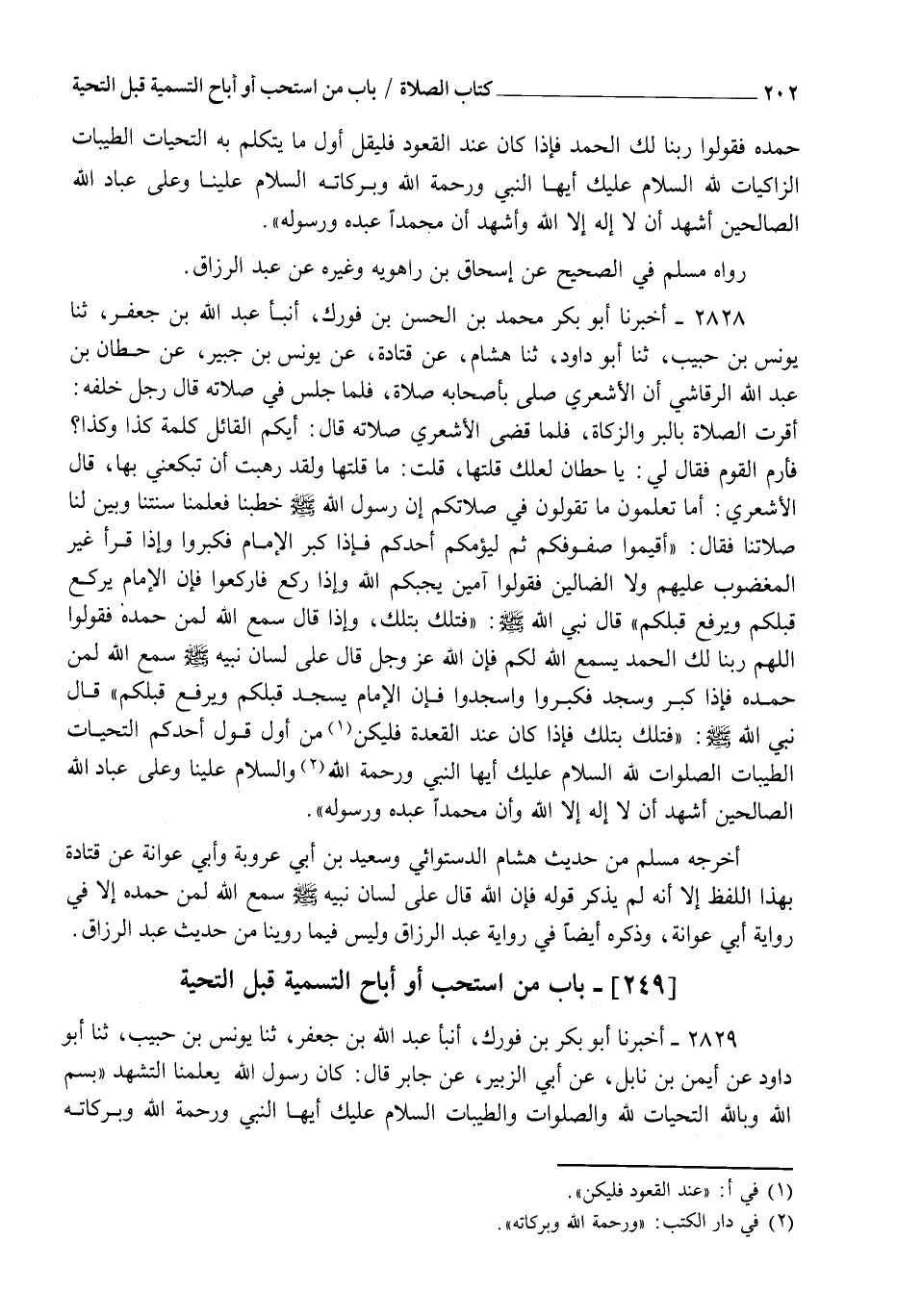 2828 - أَخْبَرَنَا أَبُو بَكْرٍ مُحَمَّدُ بْنُ الْحَسَنِ بْنِ فُورَكٍ، أنبأ عَبْدُ اللهِ بْنُ جَعْفَرٍ، ثنا يُونُسُ بْنُ حَبِيبٍ، ثنا أَبُو دَاوُدَ، ثنا هِشَامٌ، عَنْ قَتَادَةَ، عَنْ يُونُسَ بْنِ جُبَيْرٍ، عَنْ حِطَّانَ بْنِ عَبْدِ اللهِ الرَّقَاشِيِّ، أَنَّ الْأَشْعَرِيَّ صَلَّى بِأَصْحَابِهِ صَلَاةً فَلَمَّا جَلَسَ فِي صَلَاتِهِ قَالَ رَجُلٌ خَلْفَهُ: أُقِرَّتِ الصَّلَاةُ بِالْبِرِّ وَالزَّكَاةِ فَلَمَّا قَضَى الْأَشْعَرِيُّ صَلَاتَهُ قَالَ: أَيُّكُمُ الْقَائِلُ كَلِمَةَ كَذَا وَكَذَا؟ فَأَرَمَّ الْقَوْمُ فَقَالَ لِي: يَا حِطَّانُ لَعَلَّكَ قُلْتَهَا، قُلْتُ: مَا قُلْتُهَا وَلَقَدْ رَهِبْتُ أَنْ تَبْكَعَنِي بِهَا، قَالَ الْأَشْعَرِيُّ: أَمَا تَعْلَمُونَ مَا تَقُولُونَ فِي صَلَاتِكُمْ، إِنَّ رَسُولَ اللهِ صَلَّى اللهُ عَلَيْهِ وَسَلَّمَ خَطَبَنَا فَعَلَّمَنَا سُنَّتَنَا وَبَيَّنَ لَنَا صَلَاتَنَا فَقَالَ: " §أَقِيمُوا صُفُوفَكُمْ ثُمَّ لِيَؤُمَّكُمْ أَحَدُكُمْ، فَإِذَا كَبَّرَ الْإِمَامُ فَكَبِّرُوا، وَإِذَا قَرَأَ: غَيْرِ الْمَغْضُوبِ عَلَيْهِمْ وَلَا الضَّالِّينَ، فَقُولُوا: آمِينَ يُجِبْكُمُ اللهُ، وَإِذَا رَكَعَ فَارْكَعُوا، فَإِنَّ الْإِمَامَ يَرْكَعُ قَبْلَكُمْ وَيَرْفَعُ قَبْلَكُمْ " قَالَ نَبِيُّ اللهِ صَلَّى اللهُ عَلَيْهِ وَسَلَّمَ: " فَتِلْكَ بِتِلْكَ وَإِذَا قَالَ: سَمِعَ اللهُ لِمَنْ حَمِدَهُ فَقُولُوا: اللهُمَّ رَبَّنَا لَكَ الْحَمْدُ، يَسْمَعِ اللهُ لَكُمْ فَإِنَّ اللهَ عَزَّ وَجَلَّ قَالَ عَلَى لِسَانِ نَبِيِّهِ صَلَّى اللهُ عَلَيْهِ وَسَلَّمَ: سَمِعَ اللهُ لِمَنْ حَمِدَهُ، فَإِذَا كَبَّرَ وَسَجَدَ فَكَبِّرُوا وَاسْجُدُوا، فَإِنَّ الْإِمَامَ يَسْجُدُ قَبْلَكُمْ وَيَرْفَعُ قَبْلَكُمْ " قَالَ نَبِيُّ اللهِ صَلَّى اللهُ عَلَيْهِ وَسَلَّمَ: " فَتِلْكَ بِتِلْكَ فَإِذَا كَانَ عِنْدَ الْقَعْدَةِ فَلْيَكُنْ مِنْ أَوَّلِ قَوْلِ أَحَدِكُمْ: التَّحِيَّاتُ الطَّيِّبَاتُ الصَّلَوَاتُ لِلَّهِ، السَّلَامُ عَلَيْكَ أَيُّهَا النَّبِيُّ وَرَحْمَةُ اللهِ، وَالسَّلَامُ عَلَيْنَا وَعَلَى عِبَادِ اللهِ الصَّالِحِينَ أَشْهَدُ أَنْ لَا إِلَهَ إِلَّا اللهُ وَأَشْهَدُ أَنَّ مُحَمَّدًا عَبْدُهُ وَرَسُولُهُ " أَخْرَجَهُ مُسْلِمٌ مِنْ حَدِيثِ هِشَامٍ الدَّسْتُوَائِيِّ، وَسَعِيدِ بْنِ أَبِي عَرُوبَةَ، وَأَبِي عَوَانَةَ، عَنْ قَتَادَةَ بِهَذَا اللَّفْظِ إِلَّا أَنَّهُ لَمْ يَذْكُرْ قَوْلَهُ: فَإِنَّ اللهَ قَالَ عَلَى لِسَانِ نَبِيِّهِ صَلَّى اللهُ عَلَيْهِ وَسَلَّمَ: سَمِعَ اللهُ لِمَنْ حَمِدَهُ إِلَّا فِي رِوَايَةِ أَبِي عَوَانَةَ، وَذَكَرَهُ أَيْضًا فِي رِوَايَةِ عَبْدِ الرَّزَّاقِ، وَلَيْسَ فِيمَا رُوِّينَا مِنْ حَدِيثِ عَبْدِ الرَّزَّاقِ