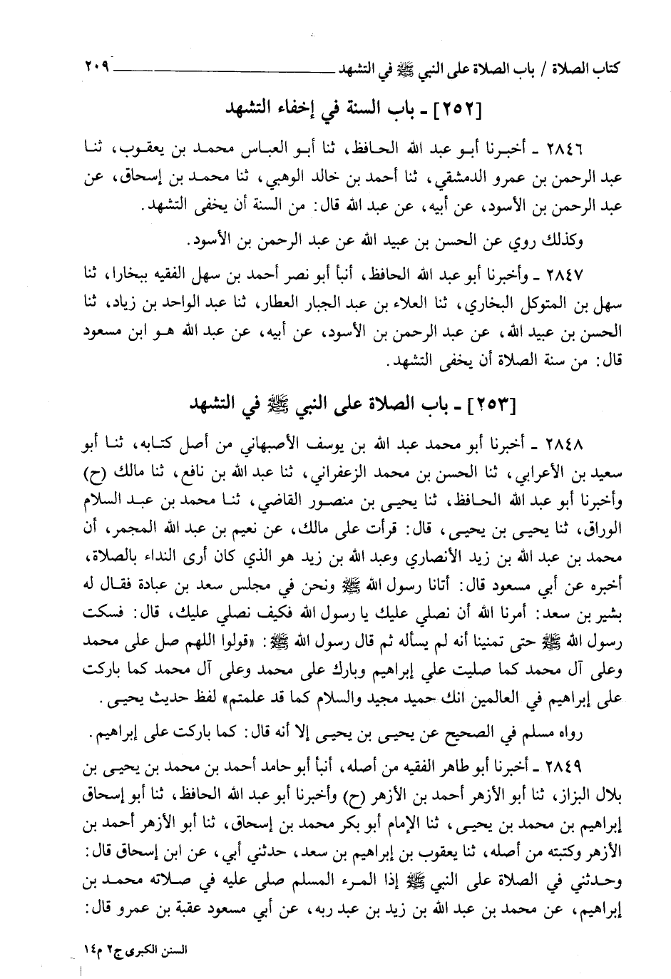 2847 - وَأَخْبَرَنَا أَبُو عَبْدِ اللهِ الْحَافِظُ، أنبأ أَبُو نَصْرٍ أَحْمَدُ بْنُ سَهْلٍ الْفَقِيهُ بِبُخَارَا، ثنا سَهْلُ بْنُ الْمُتَوَكِّلِ الْبُخَارِيُّ، ثنا الْعَلَاءُ بْنُ عَبْدِ الْجَبَّارِ الْعَطَّارُ، ثنا عَبْدُ الْوَاحِدِ بْنُ زِيَادٍ، ثنا الْحَسَنُ بْنُ عُبَيْدِ اللهِ، عَنْ عَبْدِ الرَّحْمَنِ بْنِ الْأَسْوَدِ، عَنْ أَبِيهِ، عَنْ عَبْدِ اللهِ هُوَ ابْنُ مَسْعُودٍ قَالَ: §" مِنْ سُنَّةِ الصَّلَاةِ أَنْ يُخْفِيَ التَّشَهُّدَ "