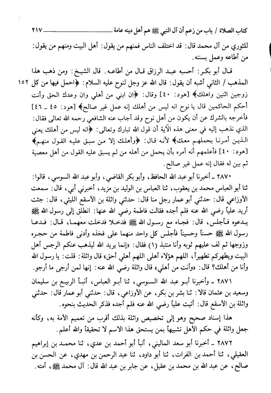2871 - وَأَخْبَرَنَا أَبُو عَبْدِ اللهِ السُّوسِيُّ، ثنا أَبُو الْعَبَّاسِ، أنبأ الرَّبِيعُ بْنُ سُلَيْمَانَ، وَسَعِيدُ بْنُ عُثْمَانَ قَالَا: ثنا بِشْرُ بْنُ بَكْرٍ، عَنِ الْأَوْزَاعِيِّ قَالَ: حَدَّثَنِي أَبُو عَمَّارٍ قَالَ: حَدَّثَنِي وَاثِلَةُ بْنُ الْأَسْقَعِ قَالَ: أَتَيْتُ عَلِيًّا رَضِيَ اللهُ عَنْهُ فَلَمْ أَجِدْهُ، فَذَكَرَ الْحَدِيثَ بِنَحْوِهِ هَذَا إِسْنَادٌ صَحِيحٌ وَهُوَ إِلَى تَخْصِيصِ وَاثِلَةَ بِذَلِكَ أَقْرَبُ مِنْ تَعْمِيمِ الْأُمَّةِ بِهِ، وَكَأَنَّهُ جَعَلَ وَاثِلَةَ فِي حُكْمِ الْأَهْلِ تَشْبِيهًا بِمَنْ يَسْتَحِقُّ هَذَا الِاسْمَ لَا تَحْقِيقًا، وَاللهُ أَعْلَمُ