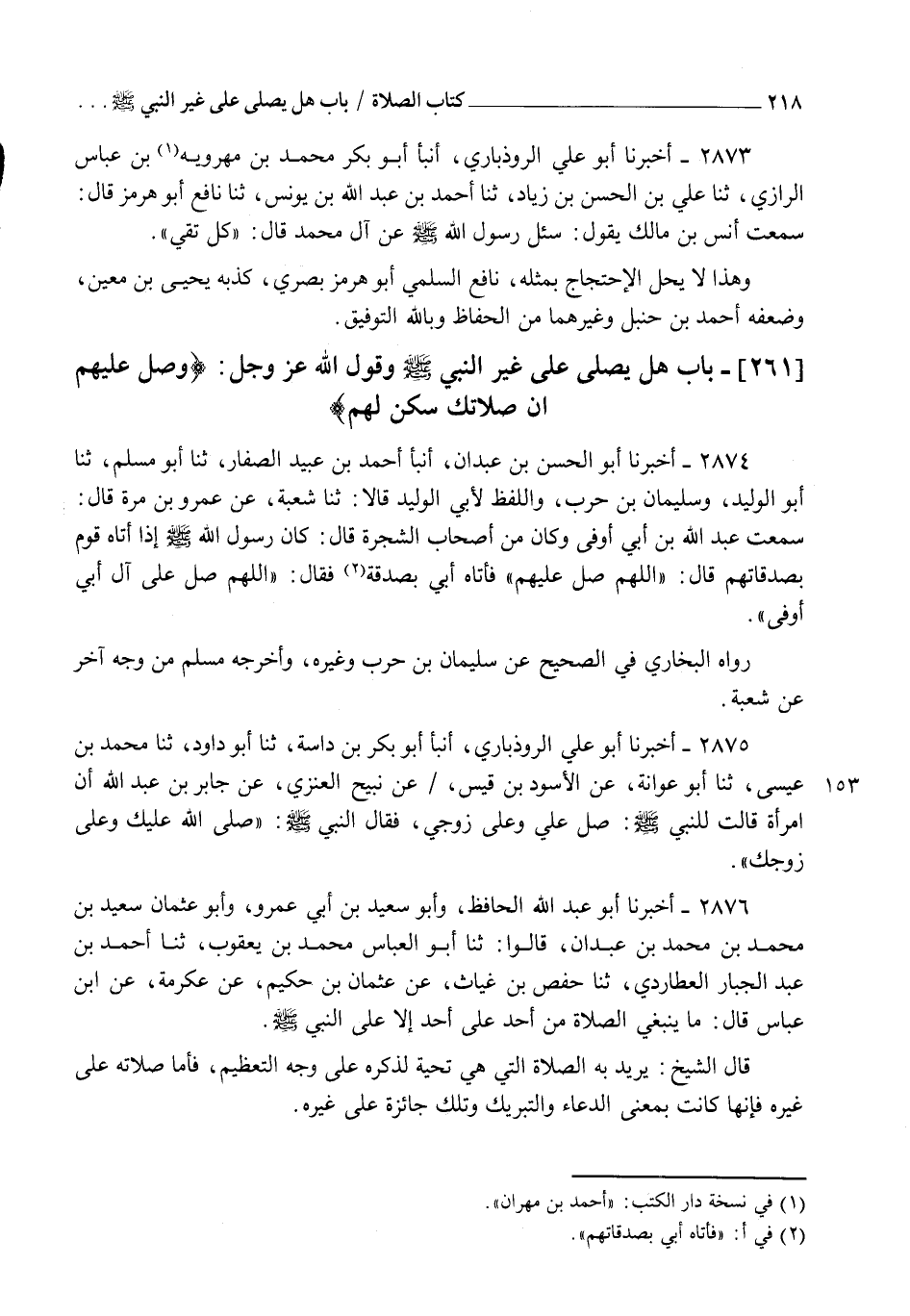 2876 - أَخْبَرَنَا أَبُو عَبْدِ اللهِ الْحَافِظُ، وَأَبُو سَعِيدِ بْنُ أَبِي عَمْرٍو، وَأَبُو عُثْمَانَ سَعِيدُ بْنُ مُحَمَّدِ بْنِ مُحَمَّدِ بْنِ عَبْدَانَ قَالُوا: ثنا أَبُو الْعَبَّاسِ مُحَمَّدُ بْنُ يَعْقُوبَ، ثنا أَحْمَدُ بْنُ عَبْدِ الْجَبَّارِ الْعُطَارِدِيُّ، ثنا حَفْصُ بْنُ غِيَاثٍ، عَنْ عُثْمَانَ بْنِ حَكِيمٍ، عَنْ عِكْرِمَةَ، عَنِ ابْنِ عَبَّاسٍ قَالَ: §" مَا يَنْبَغِي الصَّلَاةُ مِنْ أَحَدٍ عَلَى أَحَدٍ إِلَّا عَلَى النَّبِيِّ صَلَّى اللهُ عَلَيْهِ وَسَلَّمَ " قَالَ الشَّيْخُ: يُرِيدُ بِهِ الصَّلَاةَ الَّتِي هِيَ تَحِيَّةٌ لَذِكْرِهِ عَلَى وَجْهِ التَّعْظِيمِ، فَأَمَّا صَلَاتُهُ عَلَى غَيْرِهِ فَإِنَّهَا كَانَتْ بِمَعْنَى الدُّعَاءِ وَالتَّبْرِيكِ وَتِلْكَ جَائِزَةٌ عَلَى غَيْرِهِ