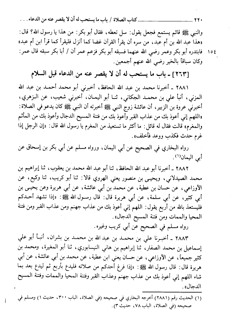2883 - أَخْبَرَنَا عَلِيُّ بْنُ مُحَمَّدِ بْنِ عَبْدِ اللهِ بْنِ مُحَمَّدِ بْنِ بِشْرَانَ، أنبأ أَبُو عَلِيٍّ إِسْمَاعِيلُ بْنُ مُحَمَّدٍ الصَّفَّارُ، ثنا إِبْرَاهِيمُ بْنُ هَانِي النَّيْسَابُورِيُّ، ثنا أَبُو الْمُغِيرَةِ، وَمُحَمَّدُ بْنُ كَثِيرٍ جَمِيعًا، عَنِ الْأَوْزَاعِيِّ، عَنْ حَسَّانَ يَعْنِي ابْنَ عَطِيَّةَ، عَنْ مُحَمَّدِ بْنِ أَبِي عَائِشَةَ، عَنْ أَبِي هُرَيْرَةَ قَالَ: قَالَ رَسُولُ اللهِ صَلَّى اللهُ عَلَيْهِ وَسَلَّمَ: " §إِذَا فَرَغَ أَحَدُكُمْ مِنْ صَلَاتِهِ فَلْيَدْعُ بِأَرْبَعٍ، ثُمَّ لِيَدْعُ بَعْدُ بِمَا شَاءَ: اللهُمَّ إِنِّي أَعُوذُ بِكَ مِنْ عَذَابِ جَهَنَّمَ، وَعَذَابِ الْقَبْرِ، وَفِتْنَةِ الْمَحْيَا وَالْمَمَاتِ، وَفِتْنَةِ الْمَسِيحِ الدَّجَّالِ "