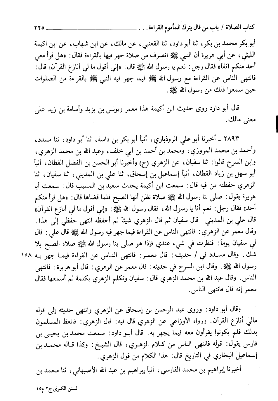 2893 - أَخْبَرَنَا أَبُو عَلِيٍّ الرُّوذْبَارِيُّ، أنبأ أَبُو بَكْرِ بْنُ دَاسَةَ، ثنا أَبُو دَاوُدَ، ثنا مُسَدَّدٌ، وَأَحْمَدُ بْنُ مُحَمَّدٍ الْمَرْوَزِيُّ، وَمُحَمَّدُ بْنُ أَحْمَدَ بْنِ أَبِي خَلَفٍ، وَعَبْدُ اللهِ بْنُ مُحَمَّدٍ الزُّهْرِيُّ، وَابْنُ السَّرْحِ قَالُوا: ثنا سُفْيَانُ، عَنِ الزُّهْرِيِّ، ح وَأَخْبَرَنَا أَبُو الْحُسَيْنِ بْنُ الْفَضْلِ الْقَطَّانُ، أنبأ أَبُو سَهْلِ بْنُ زِيَادٍ الْقَطَّانُ، أنبأ إِسْمَاعِيلُ بْنُ إِسْحَاقَ، ثنا عَلِيُّ بْنُ الْمَدِينِيِّ، ثنا سُفْيَانُ، ثنا الزُّهْرِيُّ حَفِظْتُهُ مِنْ فِيهِ قَالَ: سَمِعْتُ ابْنَ أُكَيْمَةَ يُحَدِّثُ سَعِيدَ بْنَ الْمُسَيِّبِ قَالَ: سَمِعْتُ أَبَا هُرَيْرَةَ يَقُولُ: صَلَّى بِنَا رَسُولُ اللهِ صَلَّى اللهُ عَلَيْهِ وَسَلَّمَ صَلَاةً نَظُنُّ أَنَّهَا الصُّبْحُ، فَلَمَّا قَضَاهَا قَالَ: " هَلْ قَرَأَ مِنْكُمْ أَحَدٌ؟ " فَقَالَ رَجُلٌ: نَعَمْ، أَنَا يَا رَسُولَ اللهِ، فَقَالَ رَسُولُ اللهِ صَلَّى اللهُ عَلَيْهِ وَسَلَّمَ: " §إِنِّي أَقُولُ: مَا لِيَ أُنَازَعُ الْقُرْآنَ؟ " قَالَ عَلِيُّ بْنُ الْمَدِينِيِّ: قَالَ سُفْيَانُ، ثُمَّ قَالَ الزُّهْرِيُّ شَيْئًا لَمْ أَحْفَظْهُ، انْتَهَى حِفْظِي إِلَى هَذَا وَقَالَ مَعْمَرٌ، عَنِ الزُّهْرِيِّ: فَانْتَهَى النَّاسُ عَنِ الْقِرَاءَةِ فِيمَا جَهَرَ فِيهِ رَسُولُ اللهِ صَلَّى اللهُ عَلَيْهِ وَسَلَّمَ قَالَ عَلِيٌّ: قَالَ لِي سُفْيَانُ يَوْمًا: فَنَظَرْتُ فِي شَيْءٍ عِنْدِي فَإِذَا هُوَ صَلَّى بِنَا رَسُولُ اللهِ صَلَّى اللهُ عَلَيْهِ وَسَلَّمَ صَلَاةَ الصُّبْحِ بِلَا شَكٍّ، وَقَالَ مُسَدَّدٌ فِي حَدِيثِهِ قَالَ مَعْمَرٌ: فَانْتَهَى النَّاسُ عَنِ الْقِرَاءَةِ فِيمَا جَهَرَ بِهِ رَسُولُ اللهِ صَلَّى اللهُ عَلَيْهِ وَسَلَّمَ، وَقَالَ ابْنُ السَّرْحِ فِي حَدِيثِهِ: قَالَ مَعْمَرٌ، عَنِ الزُّهْرِيِّ قَالَ أَبُو هُرَيْرَةَ: فَانْتَهَى النَّاسُ، وَقَالَ عَبْدُ اللهِ بْنُ مُحَمَّدٍ الزُّهْرِيُّ قَالَ سُفْيَانُ وَتَكَلَّمَ الزُّهْرِيُّ بِكَلِمَةٍ لَمْ أَسْمَعْهَا، فَقَالَ مَعْمَرٌ: إِنَّهُ قَالَ: فَانْتَهَى النَّاسُ، وَقَالَ أَبُو دَاوُدَ: وَرَوَى عَبْدُ الرَّحْمَنِ بْنُ إِسْحَاقَ، عَنِ الزُّهْرِيِّ، وَانْتَهَى حَدِيثُهُ إِلَى قَوْلِهِ مَا لِي أُنَازَعُ الْقُرْآنَ؟ وَرَوَاهُ الْأَوْزَاعِيُّ، عَنِ الزُّهْرِيِّ قَالَ فِيهِ: قَالَ الزُّهْرِيُّ: فَاتَّعَظَ الْمُسْلِمُونَ بِذَلِكَ فَلَمْ يَكُونُوا يَقْرَءُونَ مَعَهُ فِيمَا يَجْهَرُ بِهِ قَالَ أَبُو دَاوُدَ: سَمِعْتُ مُحَمَّدَ بْنَ يَحْيَى بْنِ فَارِسٍ يَقُولُ: قَوْلُهُ: فَانْتَهَى النَّاسُ مِنْ كَلَامِ الزُّهْرِيِّ قَالَ الشَّيْخُ وَكَذَا قَالَهُ مُحَمَّدُ بْنُ إِسْمَاعِيلَ الْبُخَارِيُّ فِي التَّارِيخِ قَالَ: هَذَا الْكَلَامُ مِنْ قَوْلِ الزُّهْرِيِّ أَخْبَرَنَا إِبْرَاهِيمُ بْنُ مُحَمَّدٍ الْفَارِسِيُّ، أنبأ إِبْرَاهِيمُ بْنُ عَبْدِ اللهِ الْأَصْبَهَانِيُّ، ثنا مُحَمَّدُ بْنُ -[226]- سُلَيْمَانَ بْنِ فَارِسٍ قَالَ مُحَمَّدُ بْنُ إِسْمَاعِيلَ، فَذَكَرَهُ، وَقَالَ فِي ابْنِ أُكَيْمَةَ هُوَ عُمَارَةُ بْنُ أُكَيْمَةَ اللَّيْثِيُّ وَيُقَالُ عَمَّارٌ قَالَ الشَّيْخُ: وَالَّذِي يَدُلُّ عَلَى أَنَّهُ مِنْ قَوْلِ الزُّهْرِيِّ