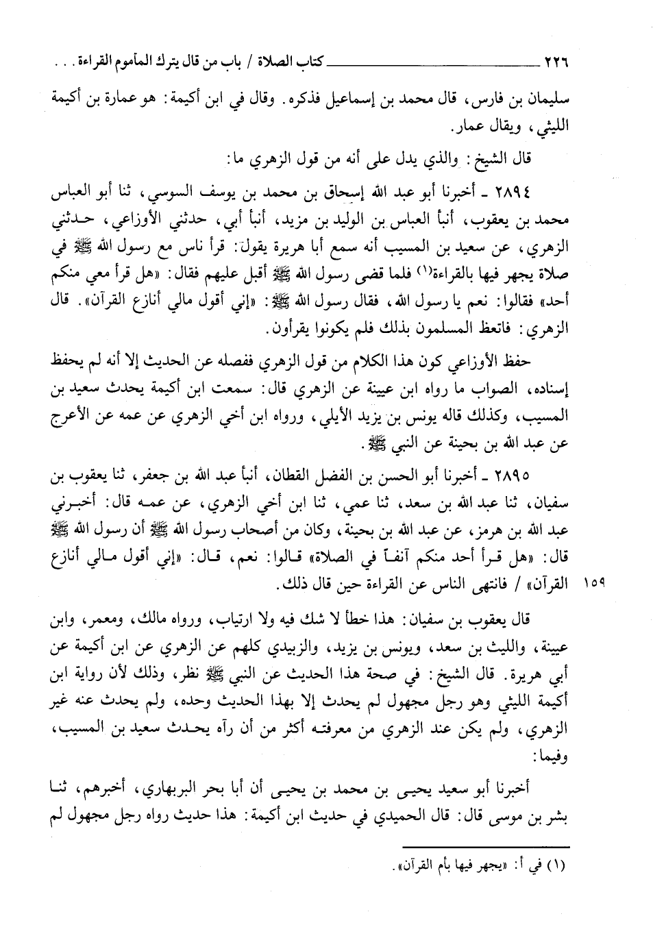 2895 - أَخْبَرَنَا أَبُو الْحُسَيْنِ بْنُ الْفَضْلِ الْقَطَّانُ، أنبأ عَبْدُ اللهِ بْنُ جَعْفَرٍ، ثنا يَعْقُوبُ بْنُ سُفْيَانَ، ثنا عَبْدُ اللهِ بْنُ سَعْدٍ، ثنا عَمِّي، ثنا ابْنُ أَخِي الزُّهْرِيُّ، عَنْ عَمِّهِ قَالَ: أَخْبَرَنِي عَبْدُ الرَّحْمَنِ بْنُ هُرْمُزَ، عَنْ عَبْدِ اللهِ ابْنِ بُحَيْنَةَ وَكَانَ مِنْ أَصْحَابِ رَسُولِ اللهِ صَلَّى اللهُ عَلَيْهِ وَسَلَّمَ أَنَّ رَسُولَ اللهِ صَلَّى اللهُ عَلَيْهِ وَسَلَّمَ قَالَ: " هَلْ قَرَأَ أَحَدٌ مِنْكُمْ آنِفًا فِي الصَّلَاةِ؟ " قَالُوا: نَعَمْ قَالَ: §" إِنِّي أَقُولُ مَا لِيَ أُنَازَعُ الْقُرْآنَ؟ " فَانْتَهَى النَّاسُ عَنِ الْقِرَاءَةِ حِينَ قَالَ ذَلِكَ قَالَ يَعْقُوبُ بْنُ سُفْيَانَ: هَذَا خَطَأٌ لَا شَكَّ فِيهِ وَلَا ارْتِيَابَ، وَرَوَاهُ مَالِكٌ، وَمَعْمَرٌ، وَابْنُ عُيَيْنَةَ، وَاللَّيْثُ بْنُ سَعْدٍ، وَيُونُسُ بْنُ يَزِيدَ، وَالزُّبَيْدِيُّ كُلُّهُمْ، عَنِ الزُّهْرِيِّ، عَنِ ابْنِ أُكَيْمَةَ عَنْ أَبِي هُرَيْرَةَ قَالَ الشَّيْخُ: فِي صِحَّةِ هَذَا الْحَدِيثِ عَنِ النَّبِيِّ صَلَّى اللهُ عَلَيْهِ وَسَلَّمَ نَظَرٌ؛ وَذَلِكَ لِأَنَّ رِوَايَةَ ابْنِ أُكَيْمَةَ اللَّيْثِيِّ وَهُوَ رَجُلٌ مَجْهُولٌ لَمْ يُحَدِّثْ إِلَّا بِهَذَا الْحَدِيثِ وَحْدَهُ، وَلَمْ يُحَدِّثْ عَنْهُ غَيْرُ الزُّهْرِيِّ، وَلَمْ يَكُنْ عِنْدَ الزُّهْرِيِّ مِنْ مَعْرِفَتِهِ أَكْثَرُ مِنْ أَنْ رَآهُ يُحَدِّثُ سَعِيدَ بْنَ الْمُسَيِّبِ وَفِيمَا أَخْبَرَنَا أَبُو سَعِيدٍ يَحْيَى بْنُ مُحَمَّدِ بْنِ يَحْيَى، أَنَّ أَبَا بَحْرٍ الْبَرْبَهَارِيَّ، أَخْبَرَهُمْ، ثنا بِشْرُ بْنُ مُوسَى قَالَ: قَالَ الْحُمَيْدِيُّ فِي حَدِيثِ ابْنِ أُكَيْمَةَ: هَذَا حَدِيثٌ رَوَاهُ رَجُلٌ مَجْهُولٌ لَمْ -[227]- يَرْوِ عَنْهُ غَيْرُهُ قَطُّ قَالَ الشَّيْخُ فِي الْحَدِيثِ الثَّابِتِ، عَنِ الْعَلَاءِ بْنِ عَبْدِ الرَّحْمَنِ، عَنْ أَبِي السَّائِبِ، عَنْ أَبِي هُرَيْرَةَ، عَنِ النَّبِيِّ صَلَّى اللهُ عَلَيْهِ وَسَلَّمَ: " مَنْ صَلَّى صَلَاةً لَمْ يَقْرَأْ فِيهَا بِأُمِّ الْقُرْآنِ فَهِيَ خِدَاجٌ " فَقُلْتُ: يَا أَبَا هُرَيْرَةَ: إِنِّي أَكُونُ أَحْيَانًا وَرَاءَ الْإِمَامِ قَالَ: فَغَمَزَ ذِرَاعِي وَقَالَ: يَا فَارِسِيُّ: اقْرَأْ بِهَا فِي نَفْسِكَ. وَأَبُو هُرَيْرَةَ رَاوِي الْحَدِيثَيْنِ دَلِيلٌ عَلَى ضِعْفِ رِوَايَةِ ابْنِ أُكَيْمَةَ، أَوْ أَرَادَ بِمَا فِي حَدِيثِ ابْنِ أُكَيْمَةَ الْمَنْعَ عَنِ الْجَهْرِ بِالْقِرَاءَةِ خَلْفَ الْإِمَامِ أَوِ الْمَنْعَ عَنْ قِرَاءَةِ السُّورَةِ فِيمَا يَجْهَرُ فِيهِ بِالْقِرَاءَةِ وَهُوَ مِثْلُ حَدِيثِ عِمْرَانَ بْنِ حُصَيْنٍ الْوَارِدِ فِي هَذَا الْبَابِ، وَهُوَ مَذْكُورٌ فِي الْبَابِ الَّذِي يَلِيهِ