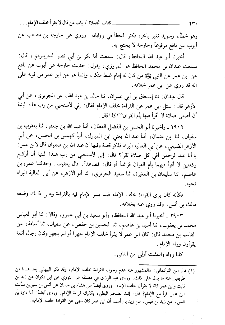 2903 - أَخْبَرَنَا أَبُو عَبْدِ اللهِ الْحَافِظُ، وَأَبُو سَعِيدِ بْنُ أَبِي عَمْرٍو وَقَالَا: ثنا أَبُو الْعَبَّاسِ مُحَمَّدُ بْنُ يَعْقُوبَ، ثنا أُسَيْدُ بْنُ عَاصِمٍ، ثنا الْحُسَيْنُ بْنُ حَفْصٍ، عَنْ سُفْيَانَ، ثنا أُسَامَةُ، عَنِ الْقَاسِمِ بْنِ مُحَمَّدٍ قَالَ: كَانَ " ابْنُ عُمَرَ §لَا يَقْرَأُ خَلْفَ الْإِمَامِ جَهَرَ أَوْ لَمْ يَجْهَرْ، وَكَانَ رِجَالٌ أَئِمَّةٌ يَقْرَءُونَ وَرَاءَ الْإِمَامِ " كَذَا رَوَاهُ، وَالْمُثْبِتُ أَوْلَى مِنَ النَّافِي