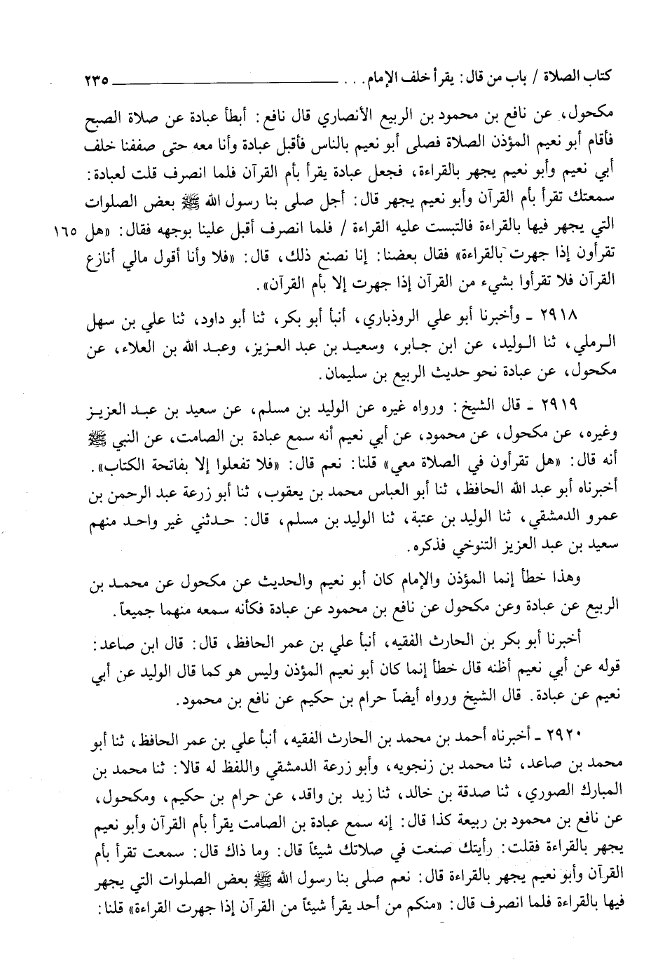 2920 - أَخْبَرَنَاهُ أَحْمَدُ بْنُ مُحَمَّدِ بْنِ الْحَارِثِ الْفَقِيهُ، أنبأ عَلِيُّ بْنُ عُمَرَ الْحَافِظُ، ثنا أَبُو مُحَمَّدِ بْنُ صَاعِدٍ، ثنا مُحَمَّدُ بْنُ زَنْجُوَيْهِ، وَأَبُو زَرْعَةَ الدِّمَشْقِيُّ وَاللَّفْظُ لَهُ قَالَا: ثنا مُحَمَّدُ بْنُ الْمُبَارَكِ الصُّورِيُّ، ثنا صَدَّقَةُ بْنُ خَالِدٍ ثنا زَيْدُ بْنُ وَاقِدٍ، عَنْ حَرَامِ بْنِ حَكِيمٍ، وَمَكْحُولٍ، عَنْ نَافِعِ بْنِ مَحْمُودِ بْنِ رَبِيعَةَ كَذَا قَالَ: إِنَّهُ سَمِعَ عُبَادَةَ بْنَ الصَّامِتِ، يَقْرَأُ بِأُمِّ الْقُرْآنِ وَأَبُو نُعَيْمٍ يَجْهَرُ بِالْقِرَاءَةِ، فَقُلْتُ: رَأَيْتُكَ صَنَعْتَ فِي صَلَاتِكَ شَيْئًا قَالَ: وَمَا ذَاكَ؟ قَالَ: سَمِعْتُكَ تَقْرَأُ بِأُمِّ الْقُرْآنِ وَأَبُو نُعَيْمٍ يَجْهَرُ بِالْقِرَاءَةِ، قَالَ: نَعَمْ، صَلَّى بِنَا رَسُولُ اللهِ صَلَّى اللهُ عَلَيْهِ وَسَلَّمَ بَعْضَ الصَّلَوَاتِ الَّتِي يَجْهَرُ فِيهَا بِالْقِرَاءَةِ فَلَمَّا انْصَرَفَ قَالَ: " مِنْكُمْ مِنْ أَحَدٍ يَقْرَأُ شَيْئًا مِنَ الْقُرْآنِ إِذَا جَهَرْتُ الْقِرَاءَةَ؟ " قُلْنَا: -[236]- نَعَمْ يَا رَسُولَ اللهِ، فَقَالَ رَسُولُ اللهِ صَلَّى اللهُ عَلَيْهِ وَسَلَّمَ: §" وَأَنَا أَقُولُ مَا لِي أُنَازَعُ الْقُرْآنَ؟ لَا يَقْرَأَنَّ أَحَدٌ مِنْكُمْ شَيْئًا مِنَ الْقُرْآنِ إِذَا جَهَرْتُ بِالْقِرَاءَةِ إِلَّا بِأُمِّ الْقُرْآنِ " قَالَ أَبُو الْحَسَنِ الدَّارَقُطْنِيُّ رَحِمَهُ اللهُ هَذَا إِسْنَادٌ حَسَنٌ وَرِجَالُهُ ثِقَاتٌ قَالَ الشَّيْخُ رَحِمَهُ اللهُ: وَكَذَلِكَ رَوَاهُ هِشَامُ بْنُ عَمَّارٍ، عَنْ صَدَقَةَ "