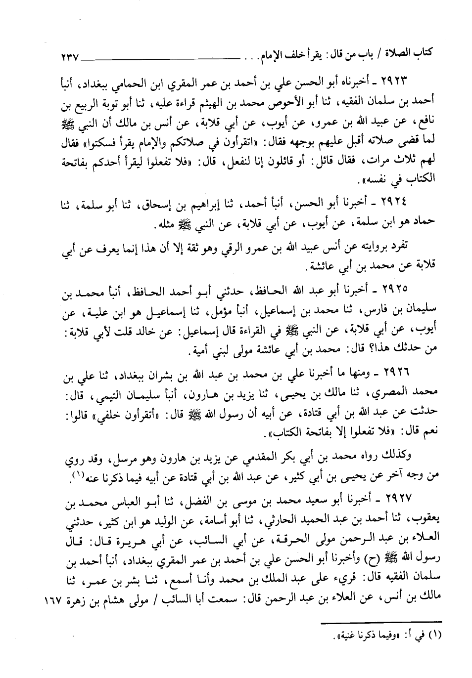 2923 - أَخْبَرَنَاهُ أَبُو الْحَسَنِ عَلِيُّ بْنُ أَحْمَدَ بْنِ عُمَرَ الْمُقْرِئُ ابْنُ الْحَمَامِيِّ بِبَغْدَادَ، أنبأ أَحْمَدُ بْنُ سَلْمَانَ الْفَقِيهُ، ثنا أَبُو الْأَحْوَصِ مُحَمَّدُ بْنُ الْهَيْثَمِ قِرَاءَةً عَلَيْهِ ثنا أَبُو تَوْبَةَ الرَّبِيعُ بْنُ نَافِعٍ، عَنْ عُبَيْدِ اللهِ بْنِ عَمْرٍو، عَنْ أَيُّوبَ، عَنْ أَبِي قِلَابَةَ، عَنْ أَنَسِ بْنِ مَالِكٍ، أَنَّ النَّبِيَّ صَلَّى اللهُ عَلَيْهِ وَسَلَّمَ لَمَّا قَضَى صَلَاتَهُ أَقْبَلَ عَلَيْهِمْ بِوَجْهِهِ، فَقَالَ: " أَتَقْرَءُونَ فِي صَلَاتِكُمْ وَالْإِمَامُ يَقْرَأُ؟ " فَسَكَتُوا، فَقَالَ لَهُمْ ثَلَاثَ مَرَّاتٍ، فَقَالَ قَائِلٌ أَوْ قَائِلُونَ: إِنَّا لَنَفْعَلُ قَالَ: §" لَا تَفْعَلُوا لِيَقْرَأْ أَحَدُكُمْ بِفَاتِحَةِ الْكِتَابِ فِي نَفْسِهِ "