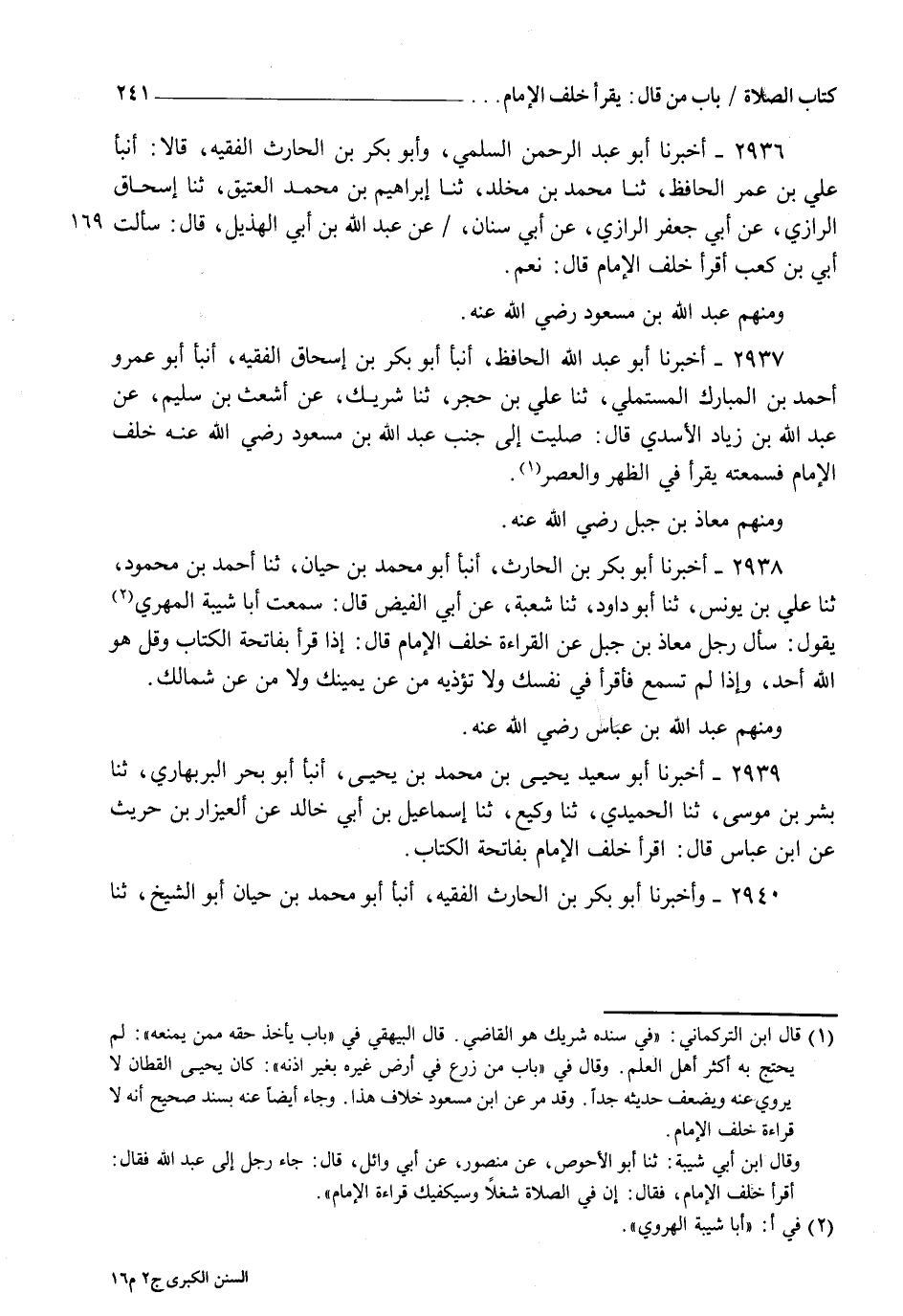 2936 - أَخْبَرَنَا أَبُو عَبْدِ الرَّحْمَنِ السُّلَمِيُّ، وَأَبُو بَكْرِ بْنُ الْحَارِثِ الْفَقِيهُ قَالَا: أنبأ عَلِيُّ بْنُ عُمَرَ الْحَافِظُ، ثنا مُحَمَّدُ بْنُ مَخْلَدٍ، ثنا إِبْرَاهِيمُ بْنُ مُحَمَّدٍ الْعَتِيقُ، ثنا إِسْحَاقُ الرَّازِيُّ، عَنْ أَبِي جَعْفَرٍ الرَّازِيِّ، عَنْ أَبِي سِنَانٍ، عَنْ عَبْدِ اللهِ بْنِ أَبِي الْهُذَيْلِ قَالَ: " §سَأَلْتُ أُبَيَّ بْنِ كَعْبٍ أَقْرَأُ خَلْفَ الْإِمَامِ؟ قَالَ: " نَعَمْ " وَمِنْهُمْ عَبْدُ اللهِ بْنُ مَسْعُودٍ رَضِيَ اللهُ عَنْهُ