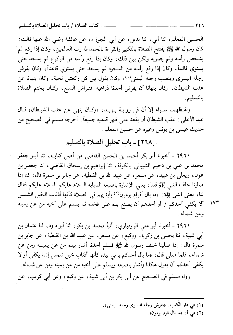 2961 - أَخْبَرَنَا أَبُو عَلِيٍّ الرُّوذْبَارِيُّ، أنبأ مُحَمَّدُ بْنُ بَكْرٍ، ثنا أَبُو دَاوُدَ، ثنا عُثْمَانُ بْنُ أَبِي شَيْبَةَ، ثنا يَحْيَى بْنُ زَكَرِيَّا، وَوَكِيعٌ، عَنْ مِسْعَرٍ، عَنْ عُبَيْدِ اللهِ بْنِ الْقِبْطِيَّةِ، عَنْ جَابِرِ بْنِ سَمُرَةَ قَالَ: إِذَا صَلَّيْنَا خَلْفَ رَسُولِ اللهِ صَلَّى اللهُ عَلَيْهِ وَسَلَّمَ فَسَلَّمَ أَحَدُنَا أَشَارَ بِيَدِهِ مِنْ عَنْ يَمِينِهِ، وَمِنْ عَنْ شِمَالِهِ، فَلَمَّا صَلَّى قَالَ: " §مَا بَالُ أَحَدِكُمْ يَرْمِي بِيَدِهِ كَأَنَّهَا أَذْنَابُ خَيْلٍ شُمْسٍ، إِنَّمَا يَكْفِي، أَوَلَا يَكْفِي أَحَدَكُمْ أَنْ يَقُولَ هَكَذَا وَأَشَارَ بِأُصْبُعِهِ وَيُسَلِّمُ عَلَى أَخِيهِ مِنْ عَنْ يَمِينِهِ، وَمِنْ عَنْ شِمَالِهِ؟ " رَوَاهُ مُسْلِمٌ فِي الصَّحِيحِ، عَنْ أَبِي بَكْرِ بْنِ أَبِي شَيْبَةَ، عَنْ وَكِيعٍ وَعَنْ أَبِي كُرَيْبٍ، عَنْ -[247]- يَحْيَى بْنِ زَكَرِيَّا بْنِ أَبِي زَائِدَةَ بِمَعْنَى هَذَا الْحَدِيثِ إِلَّا أَنَّهُ قَالَ: " أَمَا يَكْفِي لَمْ يَشُكَّ فِيهِ " وَجَعَلَ اللَّفْظَ لِابْنِ أَبِي زَائِدَةَ