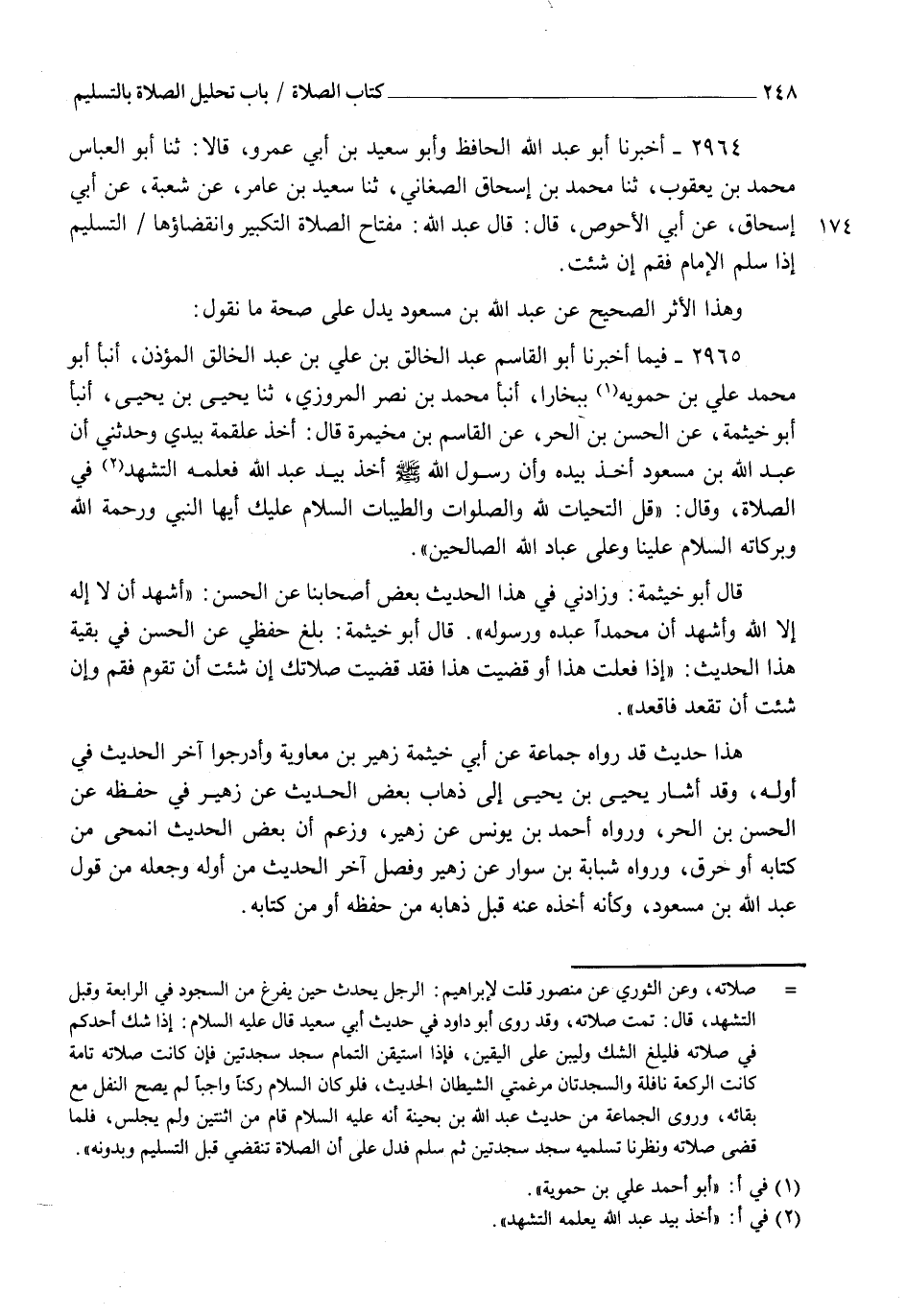 2965 - فِيمَا، أَخْبَرَنَا أَبُو الْقَاسِمِ عَبْدُ الْخَالِقِ بْنُ عَلِيِّ بْنِ عَبْدِ الْخَالِقِ الْمُؤَذِّنُ، أنبأ أَبُو مُحَمَّدٍ عَلِيُّ بْنُ حَمَّوَيْهِ بِبُخَارَا، أنبأ مُحَمَّدُ بْنُ نَصْرٍ الْمَرْوَزِيُّ، ثنا يَحْيَى بْنُ يَحْيَى، أنبأ أَبُو خَيْثَمَةَ، عَنِ الْحَسَنِ بْنِ الْحُرِّ، عَنِ الْقَاسِمِ بْنِ مُخَيْمِرَةَ قَالَ: أَخَذَ عَلْقَمَةُ بِيَدِي وَحَدَّثَنِي أَنَّ عَبْدَ اللهِ بْنَ مَسْعُودٍ أَخَذَ بِيَدِهِ وَأَنَّ رَسُولَ اللهِ صَلَّى اللهُ عَلَيْهِ وَسَلَّمَ أَخَذَ بِيَدِ عَبْدِ اللهِ فَعَلَّمَهُ التَّشَهُّدَ فِي الصَّلَاةِ وَقَالَ: " §قُلْ: التَّحِيَّاتُ لِلَّهِ وَالصَّلَوَاتُ وَالطَّيِّبَاتُ، السَّلَامُ عَلَيْكَ أَيُّهَا النَّبِيُّ وَرَحَمَةُ اللهِ وَبَرَكَاتُهُ، السَّلَامُ عَلَيْنَا وَعَلَى عِبَادِ اللهِ الصَّالِحِينَ " قَالَ أَبُو خَيْثَمَةَ: وَزَادَنِي فِي هَذَا الْحَدِيثِ بَعْضُ أَصْحَابِنَا، عَنِ الْحَسَنِ " أَشْهَدُ أَنْ لَا إِلَهَ إِلَّا اللهُ وَأَشْهَدُ أَنَّ مُحَمَّدًا عَبْدُهُ وَرَسُولُهُ " قَالَ أَبُو خَيْثَمَةَ بَلَغَ حِفْظِي، عَنِ الْحَسَنِ فِي بَقِيَّةِ هَذَا الْحَدِيثِ " إِذَا فَعَلْتَ هَذَا أَوْ قَضَيْتَ هَذَا فَقَدْ قَضَيْتَ صَلَاتَكَ إِنْ شِئْتَ أَنْ تَقُومَ فَقُمْ وَإِنْ شِئْتَ أَنْ تَقْعُدَ فَاقْعُدْ " هَذَا حَدِيثٌ قَدْ رَوَاهُ جَمَاعَةٌ، عَنْ أَبِي خَيْثَمَةَ زُهَيْرِ بْنِ مُعَاوِيَةَ وَأَدْرَجُوا آخِرَ الْحَدِيثِ فِي أَوَّلِهِ، وَقَدْ أَشَارَ يَحْيَى بْنُ يَحْيَى إِلَى ذَهَابِ بَعْضِ الْحَدِيثِ، عَنْ زُهَيْرٍ فِي حِفْظِهِ، عَنِ الْحَسَنِ بْنِ الْحُرِّ وَرَوَاهُ أَحْمَدُ بْنُ يُونُسَ، عَنْ زُهَيْرٍ وَزَعَمَ أَنَّ بَعْضَ الْحَدِيثِ انْمَحَى مِنْ كِتَابِهِ أَوْ خَرَقَ، وَرَوَاهُ شَبَابَةُ بْنُ سَوَّارٍ، عَنْ زُهَيْرٍ وَفَصَلَ آخِرَ الْحَدِيثِ مِنْ أَوَّلِهِ وَجَعَلَهُ مِنْ قَوْلِ عَبْدِ اللهِ بْنِ مَسْعُودٍ، وَكَأَنَّهُ أَخَذَهُ عَنْهُ قَبْلَ ذَهَابِهِ مِنْ حِفْظِهِ أَوْ مِنْ كِتَابِهِ -[249]-