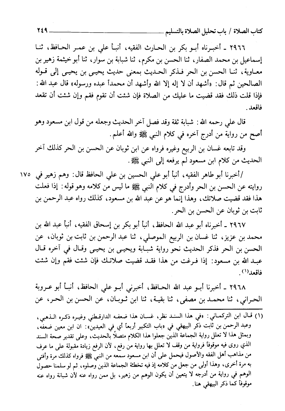 2967 - أَخْبَرَنَاهُ أَبُو عَبْدِ اللهِ الْحَافِظُ، أنبأ أَبُو بَكْرِ بْنُ إِسْحَاقَ الْفَقِيهُ، أنبأ عَبْدُ اللهِ بْنُ مُحَمَّدِ بْنِ عَزِيزٍ، ثنا غَسَّانُ بْنُ الرَّبِيعِ الْمَوْصِلِيُّ، ثنا عَبْدُ الرَّحْمَنِ بْنُ ثَابِتِ بْنِ ثَوْبَانَ، عَنِ الْحَسَنِ بْنِ الْحُرِّ، فَذَكَرَ الْحَدِيثَ نَحْوَ رِوَايَةِ شَبَابَةَ وَيَحْيَى بْنِ يَحْيَى وَقَالَ فِي آخِرِهِ: قَالَ عَبْدُ اللهِ بْنُ مَسْعُودٍ§: " إِذَا فَرَغْتَ مِنْ هَذَا فَقَدْ قَضَيْتَ صَلَاتَكَ فَإِنْ شِئْتَ فَقُمْ وَإِنْ شِئْتَ فَاقْعُدْ "
