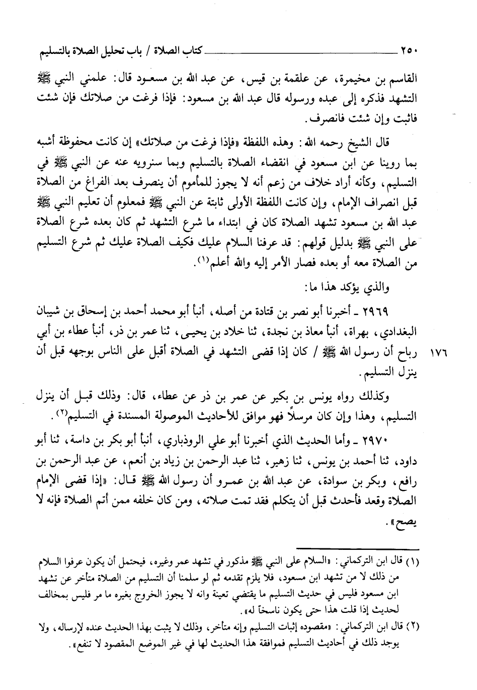 2969 - مَا أَخْبَرَنَا أَبُو نَصْرِ بْنُ قَتَادَةَ، مِنْ أَصْلِهِ أنبأ أَبُو مُحَمَّدٍ أَحْمَدُ بْنُ إِسْحَاقَ بْنِ شَيْبَانَ الْبَغْدَادِيُّ بِهَرَاةَ، أنبأ مُعَاذُ بْنُ نَجْدَةَ، ثنا خَلَّادُ بْنُ يَحْيَى، ثنا عُمَرُ بْنُ ذَرٍّ، أنبأ عَطَاءُ بْنُ أَبِي رَبَاحٍ، أَنَّ رَسُولَ اللهِ صَلَّى اللهُ عَلَيْهِ وَسَلَّمَ كَانَ §" إِذَا قَضَى التَّشَهُّدَ فِي الصَّلَاةِ أَقْبَلَ عَلَى النَّاسِ بِوَجْهِهِ قَبْلَ أَنْ يَنْزِلَ التَّسْلِيمُ " وَكَذَلِكَ رَوَاهُ يُونُسُ بْنُ بُكَيْرٍ، عَنْ عُمَرَ بْنِ ذَرٍّ، عَنْ عَطَاءٍ قَالَ: " وَذَلِكَ قَبْلَ أَنْ يَنْزِلَ التَّسْلِيمُ وَهَذَا وَإِنْ كَانَ مُرْسَلًا فَهُوَ مُوَافِقٌ لِلْأَحَادِيثِ الْمَوْصُولَةِ الْمُسْنَدَةِ فِي التَّسْلِيمِ "