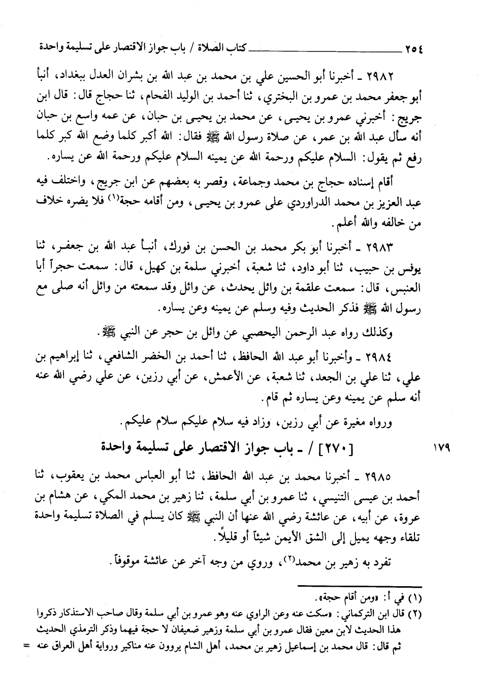 2982 - أَخْبَرَنَا أَبُو الْحُسَيْنِ عَلِيُّ بْنُ مُحَمَّدِ بْنِ عَبْدِ اللهِ بْنِ بِشْرَانَ الْعَدْلُ بِبَغْدَادَ أنبأ أَبُو جَعْفَرِ مُحَمَّدُ بْنُ عَمْرِو بْنِ الْبَخْتَرِيِّ، ثنا أَحْمَدُ بْنُ الْوَلِيدِ الْفَحَّامُ، ثنا حَجَّاجٌ قَالَ: قَالَ ابْنُ جُرَيْجٍ، أَخْبَرَنِي عَمْرُو بْنُ يَحْيَى، عَنْ مُحَمَّدِ بْنِ يَحْيَى بْنِ حَبَّانَ، عَنْ عَمِّهِ وَاسِعِ بْنِ حَبَّانَ أَنَّهُ سَأَلَ عَبْدَ اللهِ بْنَ عُمَرَ، عَنْ صَلَاةِ رَسُولِ اللهِ صَلَّى اللهُ عَلَيْهِ وَسَلَّمَ، فَقَالَ: " §اللهُ أَكْبَرُ كُلَّمَا وَضَعَ، اللهُ أَكْبَرُ كُلَّمَا رَفَعَ ثُمَّ يَقُولُ: السَّلَامُ عَلَيْكُمْ وَرَحْمَةُ اللهِ عَنْ يَمِينِهِ، السَّلَامُ عَلَيْكُمْ وَرَحْمَةُ اللهِ عَنْ يَسَارِهِ " أَقَامَ إِسْنَادَهُ حَجَّاجُ بْنُ مُحَمَّدٍ وَجَمَاعَةٌ وَقَصَرَ بِهِ بَعْضُهُمْ، عَنِ ابْنِ جُرَيْجٍ وَاخْتَلَفَ فِيهِ عَبْدُ الْعَزِيزِ بْنُ مُحَمَّدٍ الدَّرَاوَرْدِيُّ عَلَى عَمْرِو بْنِ يَحْيَى وَمَنْ أَقَامَهُ حُجَّةٌ فَلَا يَضُرُّهُ خِلَافُ مَنْ خَالَفَهُ وَاللهُ أَعْلَمُ