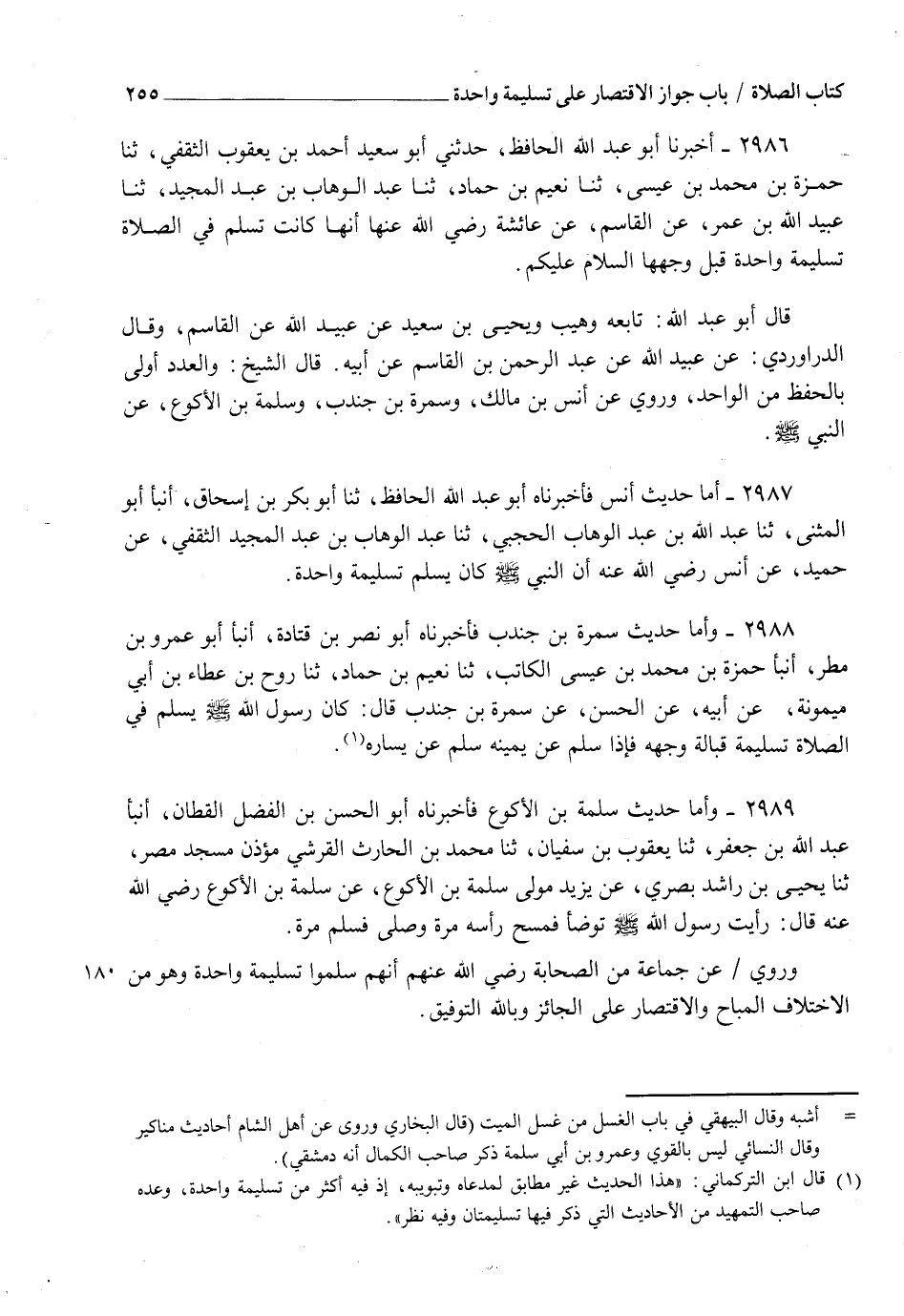 2989 - وَأَمَّا حَدِيثُ سَلَمَةَ بْنِ الْأَكْوَعِ فَأَخْبَرَنَاهُ أَبُو الْحُسَيْنِ بْنُ الْفَضْلِ الْقَطَّانُ، أنبأ عَبْدُ اللهِ بْنُ جَعْفَرٍ، ثنا يَعْقُوبُ بْنُ سُفْيَانَ، ثنا مُحَمَّدُ بْنُ الْحَارِثِ الْقُرَشِيُّ مُؤَذِّنُ مَسْجِدِ مِصْرَ، ثنا يَحْيَى بْنُ رَاشِدٍ بَصَرِيٌّ، عَنْ يَزِيدَ مَوْلَى سَلَمَةَ بْنِ الْأَكْوَعِ، عَنْ سَلَمَةَ بْنِ الْأَكْوَعِ رَضِيَ اللهُ عَنْهُ قَالَ: §" رَأَيْتُ رَسُولَ اللهِ صَلَّى اللهُ عَلَيْهِ وَسَلَّمَ تَوَضَّأَ فَمَسَحَ رَأْسَهُ مَرَّةً، وَصَلَّى فَسَلَّمَ مَرَّةً " وَرُوِيَ عَنْ جِمَاعَةٍ مِنَ الصَّحَابَةِ رَضِيَ اللهُ عَنْهُمْ أَنَّهُمْ سَلَّمُوا تَسْلِيمَةً وَاحِدَةً، وَهُوَ مِنَ الِاخْتِلَافِ الْمُبَاحِ وَالِاقْتِصَارِ عَلَى الْجَائِزِ، وَبِاللهِ التَّوْفِيقُ