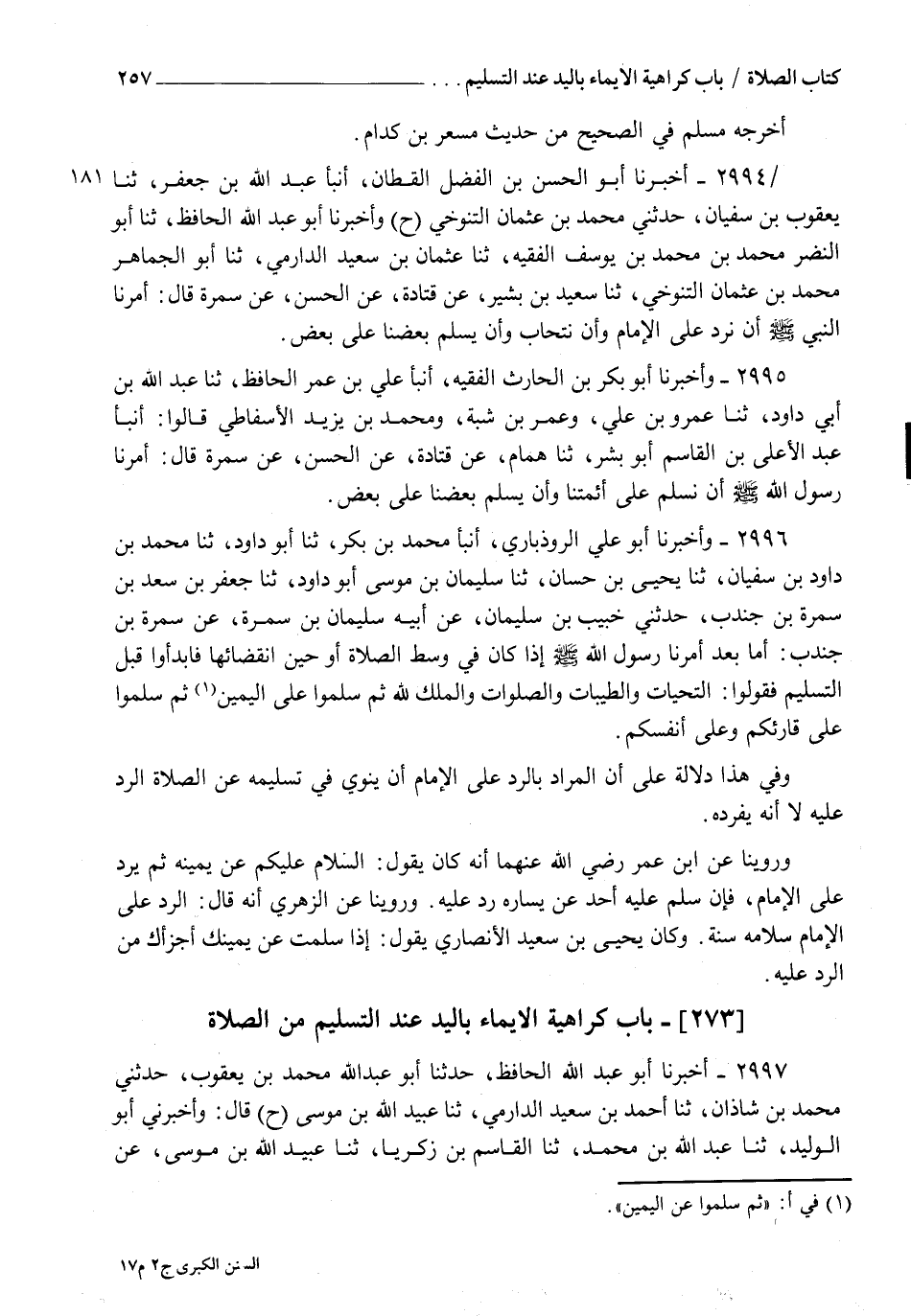 2997 - أَخْبَرَنَا أَبُو عَبْدِ اللهِ الْحَافِظُ، حَدَّثَنَا أَبُو عَبْدِ اللهِ مُحَمَّدُ بْنُ يَعْقُوبَ، حَدَّثَنِي مُحَمَّدُ بْنُ شَاذَانَ، ثنا أَحْمَدُ بْنُ سَعِيدٍ الدَّارِمِيُّ، ثنا عُبَيْدُ اللهِ بْنُ مُوسَى، ح، قَالَ: وَأَخْبَرَنِي أَبُو الْوَلِيدِ، ثنا عَبْدُ اللهِ بْنُ مُحَمَّدٍ، ثنا الْقَاسِمُ بْنُ زَكَرِيَّا، ثنا عُبَيْدُ اللهِ بْنُ مُوسَى، عَنْ -[258]- إِسْرَائِيلَ، عَنْ فُرَاتٍ الْقَزَّازِ، عَنْ عُبَيْدِ اللهِ يَعْنِي ابْنَ الْقِبْطِيَّةِ، عَنْ جَابِرِ بْنِ سَمُرَةَ قَالَ: صَلَّيْتُ مَعَ رَسُولِ اللهِ صَلَّى اللهُ عَلَيْهِ وَسَلَّمَ، فَكُنَّا إِذَا سَلَّمْنَا قُلْنَا بِأَيْدِينَا السَّلَامُ عَلَيْكُمْ، السَّلَامُ عَلَيْكُمْ، فَنَظَرَ إِلَيْنَا رَسُولُ اللهِ صَلَّى اللهُ عَلَيْهِ وَسَلَّمَ، فَقَالَ: §" مَا شَأْنُكُمْ تُشِيرُونَ بِأَيْدِيكُمْ كَأَنَّهَا أَذْنَابُ خَيْلٍ شُمْسٍ، إِذَا سَلَّمَ أَحَدُكُمْ فَلْيَلْتَفِتْ إِلَى صَاحِبِهِ وَلَا يَرْمِي بِيَدِهِ " رَوَاهُ مُسْلِمٌ فِي الصَّحِيحِ، عَنِ الْقَاسِمِ بْنِ زَكَرِيَّا