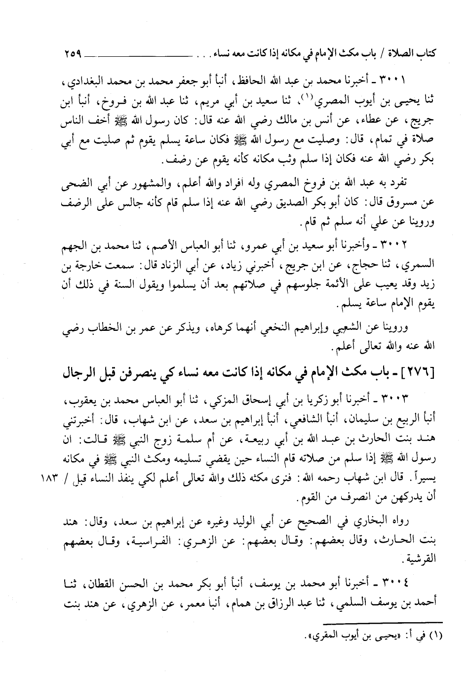 3003 - أَخْبَرَنَا أَبُو زَكَرِيَّا بْنُ أَبِي إِسْحَاقَ الْمُزَكِّي، ثنا أَبُو الْعَبَّاسِ مُحَمَّدُ بْنُ يَعْقُوبَ، أنبأ الرَّبِيعُ بْنُ سُلَيْمَانَ، أنبأ الشَّافِعِيُّ، أنبأ إِبْرَاهِيمُ بْنُ سَعْدٍ، عَنِ ابْنِ شِهَابٍ قَالَ: أَخْبَرَتْنِي هِنْدُ بِنْتُ الْحَارِثِ بْنِ عَبْدِ اللهِ بْنِ أَبِي رَبِيعَةَ، عَنْ أُمِّ سَلَمَةَ زَوْجِ النَّبِيِّ صَلَّى اللهُ عَلَيْهِ وَسَلَّمَ قَالَتْ: " كَانَ رَسُولُ اللهِ صَلَّى اللهُ عَلَيْهِ وَسَلَّمَ إِذَا §سَلَّمَ مِنْ صَلَاتِهِ قَامَ النِّسَاءُ حِينَ يَقْضِي تَسْلِيمَهُ وَمَكَثَ النَّبِيُّ صَلَّى اللهُ عَلَيْهِ وَسَلَّمَ فِي مَكَانِهِ يَسِيرًا " قَالَ: ابْنُ شِهَابٍ رَحِمَهُ اللهُ: فَنَرَى مُكْثَهُ ذَلِكَ وَاللهُ تَعَالَى أَعْلَمُ لِكَيْ يَنْفُذَ النِّسَاءُ قَبْلَ أَنْ يُدْرِكَهُنَّ مَنِ انْصَرَفَ مِنَ الْقَوْمِ، رَوَاهُ الْبُخَارِيُّ فِي الصَّحِيحِ، عَنْ أَبِي الْوَلِيدِ وَغَيْرِهِ، عَنْ إِبْرَاهِيمَ بْنِ سَعْدٍ وَقَالَ: هِنْدُ بِنْتُ الْحَارِثِ وَقَالَ بَعْضُهُمْ: عَنِ الزُّهْرِيِّ: الْفِرَاسِيَّةُ وَقَالَ بَعْضُهُمُ: الْقُرَشِيَّةُ