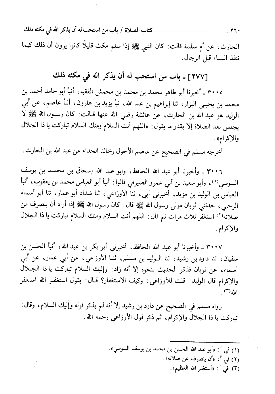 3006 - وَأَخْبَرَنَا أَبُو عَبْدِ اللهِ الْحَافِظُ، وَأَبُو عَبْدِ اللهِ إِسْحَاقُ بْنُ مُحَمَّدِ بْنِ يُوسُفَ السُّوسِيُّ، وَأَبُو سَعِيدِ بْنُ أَبِي عَمْرٍو الصَّيْرَفِيُّ، قَالُوا: أنبأ أَبُو الْعَبَّاسِ مُحَمَّدُ بْنُ يَعْقُوبَ، أنبأ الْعَبَّاسُ بْنُ الْوَلِيدِ بْنِ مَزْيَدٍ، أَخْبَرَنِي أَبِي، ثنا الْأَوْزَاعِيُّ، ثنا شَدَّادٌ أَبُو عَمَّارٍ، ثنا أَبُو أَسْمَاءَ الرَّحَبِيُّ، حَدَّثَنِي ثَوْبَانُ مَوْلَى رَسُولِ اللهِ صَلَّى اللهُ عَلَيْهِ وَسَلَّمَ قَالَ: كَانَ رَسُولُ اللهِ صَلَّى اللهُ عَلَيْهِ وَسَلَّمَ إِذَا أَرَادَ أَنْ يَنْصَرِفَ مِنْ صَلَاتِهِ اسْتَغْفَرَ ثَلَاثَ مَرَّاتٍ ثُمَّ قَالَ: §" اللهُمَّ أَنْتَ السَّلَامُ وَمِنْكَ السَّلَامُ تَبَارَكْتَ يَا ذَا الْجَلَالِ وَالْإِكْرَامِ "