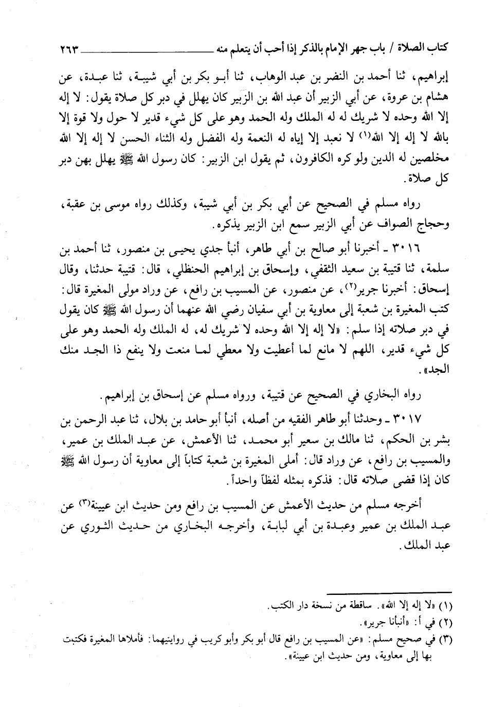 3017 - وَحَدَّثَنَا أَبُو طَاهِرٍ الْفَقِيهُ، مِنْ أَصْلِهِ أنبأ أَبُو حَامِدِ بْنُ بِلَالٍ، ثنا عَبْدُ الرَّحْمَنِ بْنُ بِشْرِ بْنِ الْحَكَمِ، ثنا مَالِكُ بْنُ سُعَيْرٍ أَبُو مُحَمَّدٍ، ثنا الْأَعْمَشُ، عَنْ عَبْدِ الْمَلِكِ بْنِ عُمَيْرٍ، وَالْمُسَيَّبِ بْنِ رَافِعٍ، عَنْ وَرَّادٍ قَالَ: أَمْلَى الْمُغِيرَةُ بْنُ شُعْبَةَ كِتَابًا إِلَى مُعَاوِيَةَ أَنَّ رَسُولَ اللهِ صَلَّى اللهُ عَلَيْهِ وَسَلَّمَ كَانَ إِذَا قَضَى صَلَاتَهُ قَالَ، فَذَكَرَهُ بِمِثْلِهِ لَفْظًا وَاحِدًا أَخْرَجَهُ مُسْلِمٌ مِنْ حَدِيثِ الْأَعْمَشِ، عَنِ الْمُسَيَّبِ بْنِ رَافِعٍ، وَمِنْ حَدِيثِ ابْنِ عُيَيْنَةَ، عَنْ عَبْدِ الْمَلِكِ بْنِ عُمَيْرٍ، وَعَبْدَةَ بْنِ أَبِي لُبَابَةَ، وَأَخْرَجَهُ الْبُخَارِيُّ مِنْ حَدِيثِ الثَّوْرِيِّ، عَنْ عَبْدِ الْمَلِكِ