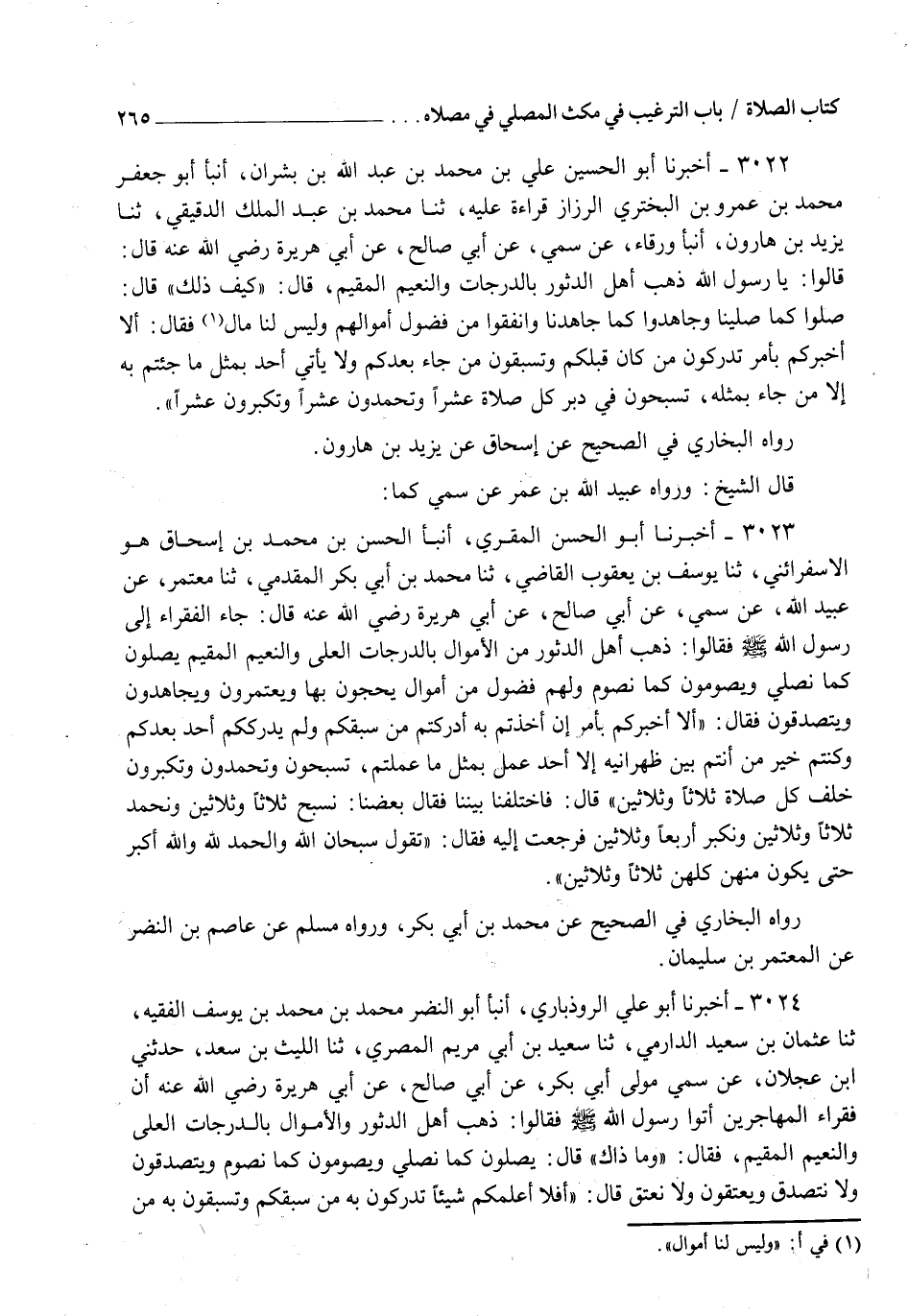 3023 - كَمَا أَخْبَرَنَا أَبُو الْحَسَنِ الْمُقْرِئُ، أنبأ الْحَسَنُ بْنُ مُحَمَّدِ بْنِ إِسْحَاقَ هُوَ الْإِسْفَرَايِينِيُّ، ثنا يُوسُفُ بْنُ يَعْقُوبَ الْقَاضِي، ثنا مُحَمَّدُ بْنُ أَبِي بَكْرٍ الْمُقَدَّمِيُّ، ثنا مُعْتَمِرٌ، عَنْ عُبَيْدِ اللهِ، عَنْ سُمَيٍّ، عَنْ أَبِي صَالِحٍ، عَنْ أَبِي هُرَيْرَةَ رَضِيَ اللهُ عَنْهُ قَالَ: جَاءَ الْفُقَرَاءُ إِلَى رَسُولِ اللهِ صَلَّى اللهُ عَلَيْهِ وَسَلَّمَ، فَقَالُوا: ذَهَبَ أَهْلُ الدُّثُورِ مِنَ الْأَمْوَالِ بِالدَّرَجَاتِ الْعُلَى وَالنَّعِيمِ الْمُقِيمِ، يُصَلُّونَ كَمَا نُصَلِّي وَيَصُومُونَ كَمَا نَصُومُ، وَلَهُمْ فُضُولٌ مِنْ أَمْوَالٍ يَحُجُّونَ بِهَا وَيَعْتَمِرُونَ وَيُجَاهِدُونَ وَيَتَصَدَّقُونَ، فَقَالَ: §" أَلَا أُخْبِرُكُمْ بِأَمْرٍ إِنْ أَخَذْتُمْ بِهِ أَدْرَكْتُمْ مَنْ سَبَقَكُمْ وَلَمْ يُدْرِكْكُمْ أَحَدٌ بَعْدَكُمْ وَكُنْتُمْ خَيْرَ مَنْ أَنْتُمْ بَيْنَ ظَهْرَانَيْهِ إِلَّا أَحَدٌ عَمِلَ بِمِثْلِ مَا عَمِلْتُمْ، تُسَبِّحُونَ وَتَحْمَدُونَ وَتُكَبِّرُونَ خَلْفَ كُلِّ صَلَاةٍ ثَلَاثًا وَثَلَاثِينَ " قَالَ: فَاخْتَلَفْنَا بَيْنَنَا، فَقَالَ بَعْضُنَا: نُسَبِّحُ ثَلَاثًا وَثَلَاثِينَ، وَنَحْمَدُ ثَلَاثًا وَثَلَاثِينَ، وَنُكَبِّرُ أَرْبَعًا وَثَلَاثِينَ، فَرَجَعْتُ إِلَيْهِ، فَقَالَ: " تَقُولُ: سُبْحَانَ اللهِ وَالْحَمْدُ لِلَّهِ وَاللهُ أَكْبَرُ، حَتَّى يَكُونَ مِنْهُنَّ كُلِّهُنَّ ثَلَاثًا وَثَلَاثِينَ " رَوَاهُ الْبُخَارِيُّ فِي الصَّحِيحِ، عَنْ مُحَمَّدِ بْنِ أَبِي بَكْرٍ، وَرَوَاهُ مُسْلِمٌ عَنْ عَاصِمِ بْنِ النَّضْرِ، عَنِ الْمُعْتَمِرِ بْنِ سُلَيْمَانَ