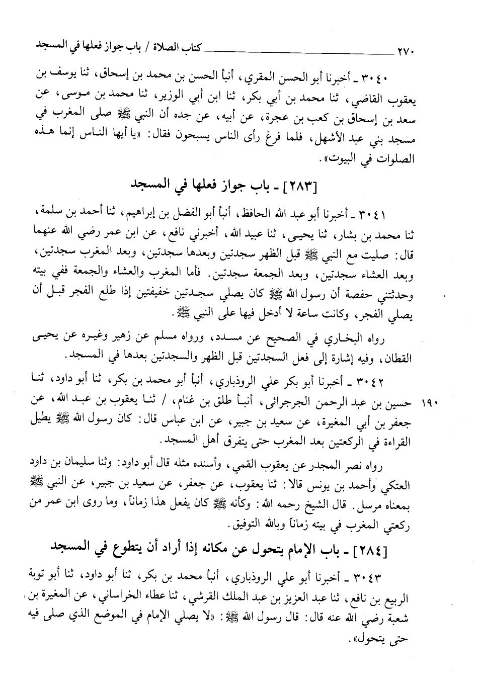 3042 - أَخْبَرَنَا أَبُو عَلِيٍّ الرُّوذْبَارِيُّ، أنبأ مُحَمَّدُ بْنُ بَكْرٍ ثنا أَبُو دَاوُدَ، ثنا حُسَيْنُ بْنُ عَبْدِ الرَّحْمَنِ الْجَرْجَرَائِيُّ، أنبأ طَلْقُ بْنُ غَنَّامٍ، ثنا يَعْقُوبُ بْنُ عَبْدِ اللهِ، عَنْ جَعْفَرِ بْنِ أَبِي الْمُغِيرَةِ، عَنْ سَعِيدِ بْنِ جُبَيْرٍ، عَنِ ابْنِ عَبَّاسٍ قَالَ: كَانَ رَسُولُ اللهِ صَلَّى اللهُ عَلَيْهِ وَسَلَّمَ §" يُطِيلُ الْقِرَاءَةَ فِي الرَّكْعَتَيْنِ بَعْدَ الْمَغْرِبِ حَتَّى يَتَفَرَّقَ أَهْلُ الْمَسْجِدِ " رَوَاهُ نَصْرٌ الْمُجَدَّرُ، عَنْ يَعْقُوبَ الْقُمِّيِّ وَأَسْنَدَهُ مِثْلَهُ قَالَ أَبُو دَاوُدَ، وَثنا سُلَيْمَانُ بْنُ دَاوُدَ الْعَتَكِيُّ، وَأَحْمَدُ بْنُ يُونُسَ، قَالَا: ثنا يَعْقُوبُ، عَنْ جَعْفَرٍ، عَنْ سَعِيدِ بْنِ جُبَيْرٍ، عَنِ النَّبِيِّ صَلَّى اللهُ عَلَيْهِ وَسَلَّمَ بِمَعْنَاهُ مُرْسَلٌ قَالَ الشَّيْخُ رَحِمَهُ اللهُ: وَكَأَنَّهُ صَلَّى اللهُ عَلَيْهِ وَسَلَّمَ كَانَ يَفْعَلُ هَذَا زَمَانًا، وَمَا رَوَى ابْنُ عُمَرَ مِنْ رَكْعَتَيِ الْمَغْرِبِ فِي بَيْتِهِ زَمَانًا وَبِاللهِ التَّوْفِيقُ