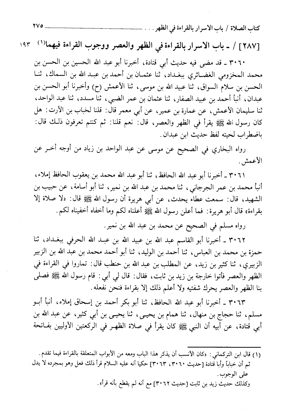 3062 - أَخْبَرَنَا أَبُو الْقَاسِمِ عَبْدُ الرَّحْمَنِ بْنِ عُبَيْدِ اللهِ بْنِ عَبْدِ اللهِ الْحُرْفِيُّ بِبَغْدَادَ ثنا حَمْزَةُ بْنُ مُحَمَّدِ بْنِ الْعَبَّاسِ، ثنا أَحْمَدُ بْنُ الْوَلِيدِ، ثنا أَبُو أَحْمَدَ مُحَمَّدُ بْنُ عَبْدِ اللهِ بْنِ الزُّبَيْرِ الزُّبَيْرِيُّ، ثنا كَثِيرُ بْنُ زَيْدٍ، عَنِ الْمُطَّلِبِ بْنِ عَبْدِ اللهِ بْنِ حَنْطَبٍ قَالَ: تَمَارَوْا فِي الْقِرَاءَةِ فِي الظُّهْرِ وَالْعَصْرِ فَأَتَوْا خَارِجَةَ بْنَ زَيْدِ بْنِ ثَابِتٍ فَقَالَ: قَالَ لِي أَبِي: " قَامَ رَسُولُ اللهِ صَلَّى اللهُ عَلَيْهِ وَسَلَّمَ §فَصَلَّى بِنَا الظُّهْرَ وَالْعَصْرَ يُحَرِّكُ شَفَتَيْهِ، وَلَا أَعْلَمُ ذَلِكَ إِلَّا بِقِرَاءَةٍ فَنَحْنُ نَفْعَلُهُ "