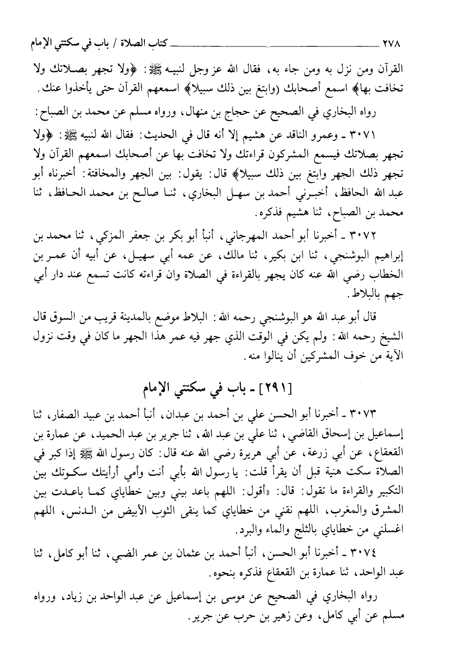 3072 - أَخْبَرَنَا أَبُو أَحْمَدَ الْمِهْرَجَانِيُّ، أنبأ أَبُو بَكْرِ بْنُ جَعْفَرٍ الْمُزَكِّي، ثنا مُحَمَّدُ بْنُ إِبْرَاهِيمَ الْبُوشَنْجِيُّ، ثنا ابْنُ بُكَيْرٍ، ثنا مَالِكٌ، عَنْ عَمِّهِ أَبِي سُهَيْلٍ، عَنْ أَبِيهِ، أَنَّ عُمَرَ بْنَ الْخَطَّابِ رَضِيَ اللهُ عَنْهُ كَانَ §" يَجْهَرُ بِالْقِرَاءَةِ فِي الصَّلَاةِ وَإِنَّ قِرَاءَتَهُ كَانَتْ تُسْمَعُ عِنْدَ دَارِ أَبِي جَهْمٍ بِالْبَلَاطِ " قَالَ أَبُو عَبْدِ اللهِ هُوَ الْبُوشَنْجِيُّ رَحِمَهُ اللهُ، الْبَلَاطُ مَوْضِعٌ بِالْمَدِينَةِ قَرِيبٌ مِنَ السُّوقِ قَالَ الشَّيْخُ رَحِمَهُ اللهُ: وَلَمْ يَكُنْ فِي الْوَقْتِ الَّذِي جَهَرَ فِيهِ عُمَرُ هَذَا الْجَهْرَ مَا كَانَ فِي وَقْتِ نُزُولِ الْآيَةِ مِنْ خَوْفِ الْمُشْرِكِينَ أَنْ يَنَالُوا مِنْهُ