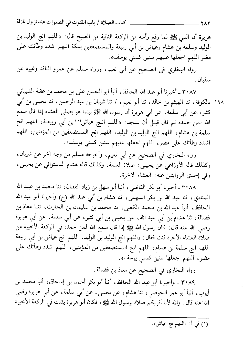 3087 - أَخْبَرَنَا أَبُو عَبْدِ اللهِ الْحَافِظُ، أنبأ أَبُو الْحَسَنِ عَلِيُّ بْنُ مُحَمَّدِ بْنِ عُقْبَةَ الشَّيْبَانِيُّ بِالْكُوفَةِ ثنا الْهَيْثَمُ بْنُ خَالِدٍ، ثنا أَبُو نُعَيْمٍ، ثنا شَيْبَانُ بْنُ عَبْدِ الرَّحْمَنِ، ثنا يَحْيَى بْنُ أَبِي كَثِيرٍ، عَنْ أَبِي سَلَمَةَ، عَنْ أَبِي هُرَيْرَةَ، أَنَّ رَسُولَ اللهِ صَلَّى اللهُ عَلَيْهِ وَسَلَّمَ بَيْنَمَا هُوَ يُصَلِّي الْعِشَاءَ إِذَا قَالَ: " سَمِعَ اللهُ لِمَنْ حَمِدَهُ " ثُمَّ قَالَ قَبْلَ أَنْ يَسْجُدَ: " §اللهُمَّ أَنْجِ عَيَّاشَ بْنَ أَبِي رَبِيعَةَ، اللهُمَّ أَنْجِ سَلَمَةَ بْنَ هِشَامٍ، اللهُمَّ أَنْجِ الْوَلِيدَ بْنَ الْوَلِيدِ اللهُمَّ أَنْجِ الْمُسْتَضْعَفِينَ مِنَ الْمُؤْمِنِينَ، اللهُمَّ اشْدُدْ وَطْأَتَكَ عَلَى مُضَرَ، اللهُمَّ اجْعَلْهَا عَلَيْهِمْ سِنِينَ كَسِنِي يُوسُفَ " رَوَاهُ الْبُخَارِيُّ فِي الصَّحِيحِ، عَنْ أَبِي نُعَيْمٍ، وَأَخْرَجَهُ مُسْلِمٌ مِنْ وَجْهٍ آخَرَ، عَنْ شَيْبَانَ وَكَذَلِكَ قَالَهُ الْأَوْزَاعِيُّ، عَنْ يَحْيَى صَلَاةُ الْعَتَمَةِ وَكَذَلِكَ قَالَهُ هِشَامٌ الدَّسْتُوَائِيُّ، عَنْ يَحْيَى، وَفِي إِحْدَى الرِّوَايَتَيْنِ عَنْهُ الْعِشَاءَ الْآخِرَةَ