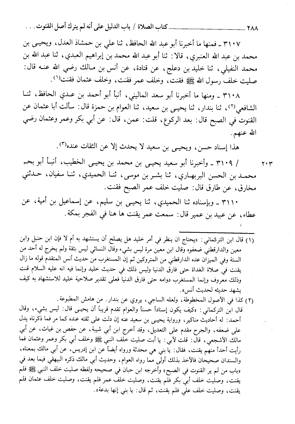 3108 - وَمِنْهَا مَا أَخْبَرَنَا أَبُو سَعْدٍ الْمَالِينِيُّ، أنبأ أَبُو أَحْمَدَ بْنُ عَدِيٍّ الْحَافِظُ، ثنا الشَّافِعِيُّ، ثنا بُنْدَارٌ، ثنا يَحْيَى بْنُ سَعِيدٍ، ثنا الْعَوَّامُ بْنُ حَمْزَةَ قَالَ: سَأَلْتُ أَبَا عُثْمَانَ عَنِ الْقُنُوتِ فِي الصُّبْحِ قَالَ: " §بَعْدَ الرُّكُوعِ " قُلْتُ: عَمَّنْ؟ قَالَ: عَنْ أَبِي بَكْرٍ وَعُمَرَ وَعُثْمَانَ رَضِيَ اللهُ عَنْهُمْ " هَذَا إِسْنَادٌ حَسَنٌ، وَيَحْيَى بْنُ سَعِيدٍ لَا يُحَدِّثُ إِلَّا عَنِ الثِّقَاتِ عِنْدَهُ