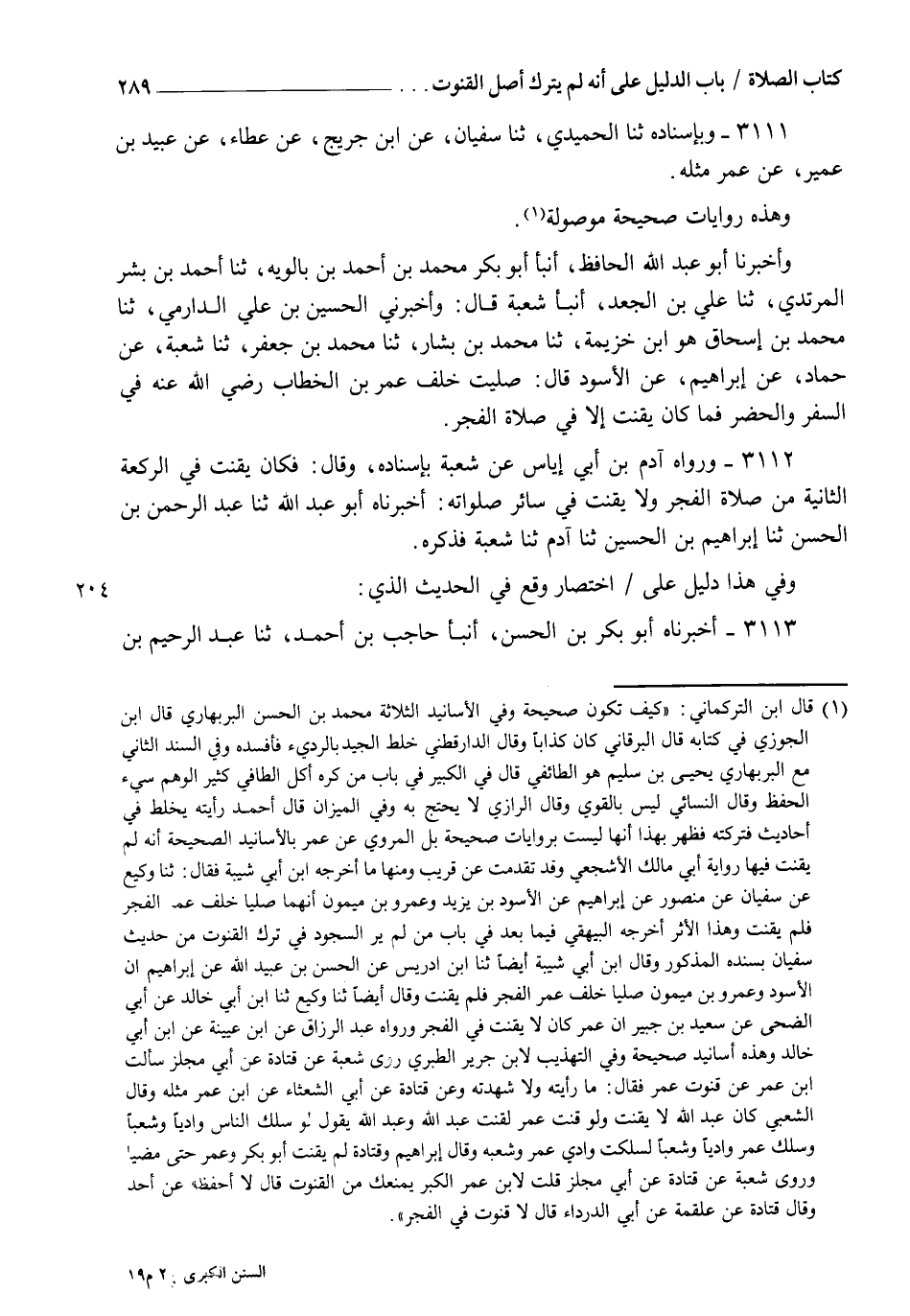 3111 - وَأَخْبَرَنَا أَبُو عَبْدِ اللهِ الْحَافِظُ، أنبأ أَبُو بَكْرٍ مُحَمَّدُ بْنُ أَحْمَدَ بْنِ بَالَوَيْهِ، ثنا أَحْمَدُ بْنُ بِشْرٍ الْمَرْثَدِيُّ، ثنا عَلِيُّ بْنُ الْجَعْدِ، أنبأ شُعْبَةُ قَالَ: وَأَخْبَرَنِي الْحُسَيْنُ بْنُ عَلِيٍّ الدَّارِمِيُّ، ثنا مُحَمَّدُ بْنُ إِسْحَاقَ هُوَ ابْنُ خُزَيْمَةَ، ثنا مُحَمَّدُ بْنُ بَشَّارٍ، ثنا مُحَمَّدُ بْنُ جَعْفَرٍ، ثنا شُعْبَةُ، عَنْ حَمَّادٍ، عَنْ إِبْرَاهِيمَ، عَنِ الْأَسْوَدِ، قَالَ: " صَلَّيْتُ خَلْفَ عُمَرَ بْنِ الْخَطَّابِ رَضِيَ اللهُ عَنْهُ فِي السَّفَرِ وَالْحَضَرِ §فَمَا كَانَ يَقْنُتُ إِلَّا فِي صَلَاةِ الْفَجْرِ "
