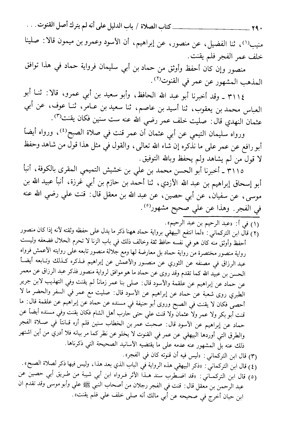 3114 - وَقَدْ أَخْبَرَنَا أَبُو عَبْدِ اللهِ الْحَافِظُ، وَأَبُو سَعِيدِ بْنُ أَبِي عَمْرٍو، قَالَا: ثنا أَبُو الْعَبَّاسِ مُحَمَّدُ بْنُ يَعْقُوبَ، ثنا أُسَيْدُ بْنُ عَاصِمٍ، ثنا سَعِيدُ بْنُ عَامِرٍ، ثنا عَوْفٌ، عَنْ أَبِي عُثْمَانَ النَّهْدِيِّ قَالَ: §" صَلَّيْتُ خَلْفَ عُمَرَ رَضِيَ اللهُ عَنْهُ سِتَّ سِنِينَ فَكَانَ يَقْنُتُ " وَرَوَاهُ سُلَيْمَانُ التَّيْمِيُّ، عَنْ أَبِي عُثْمَانَ أَنَّ عُمَرَ قَنَتَ فِي صَلَاةِ الصُّبْحِ، وَرَوَاهُ أَيْضًا أَبُو رَافِعٍ، عَنْ عُمَرَ عَلَى مَا نَذْكُرُهُ إِنْ شَاءَ اللهُ تَعَالَى وَالْقَوْلُ فِي مِثْلِ هَذَا قَوْلُ مَنْ شَاهَدَ وَحَفِظَ لَا قَوْلُ مَنْ لَمْ يُشَاهِدْ، وَلَمْ يَحْفَظْ، وَبِاللهِ التَّوْفِيقُ
