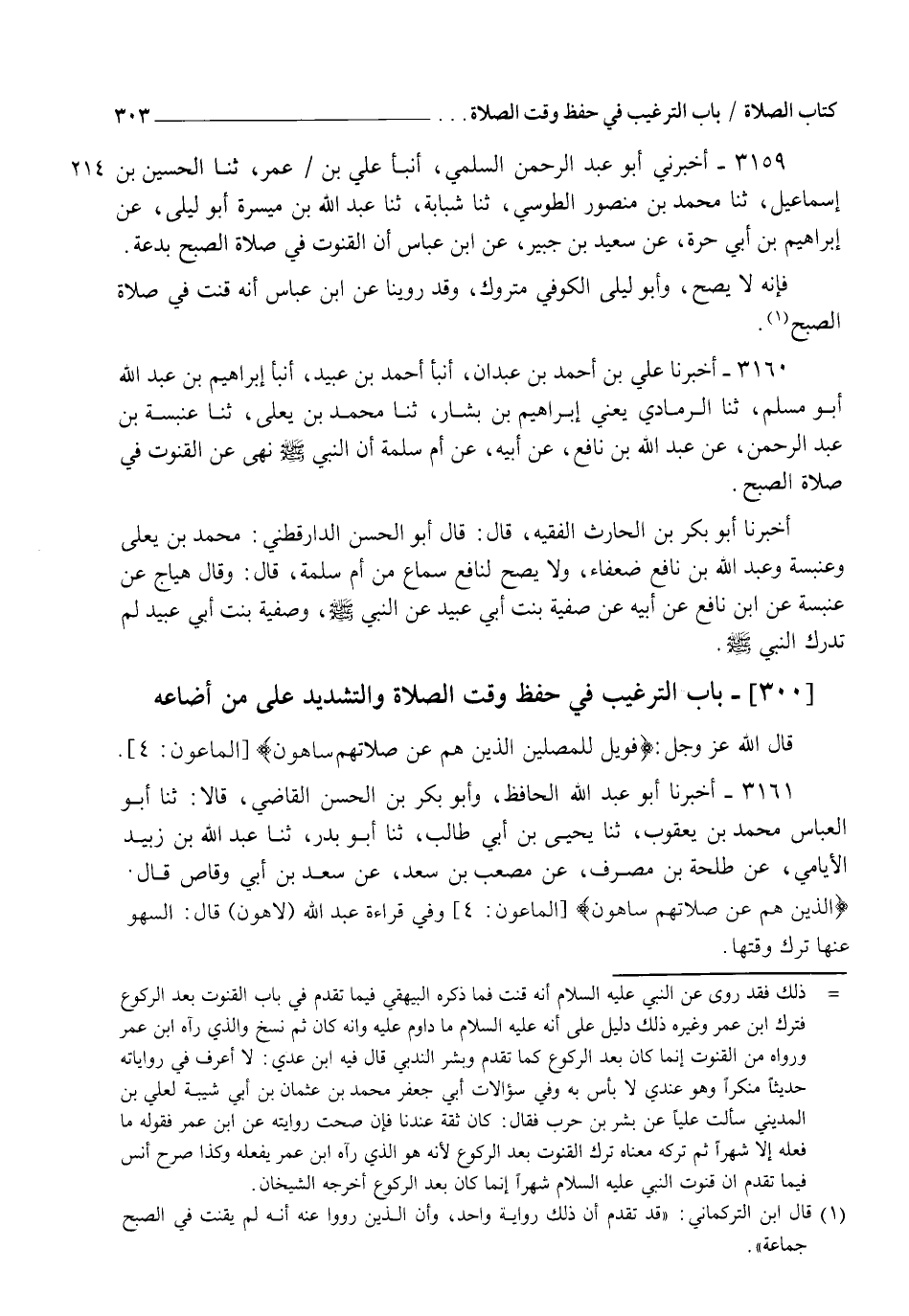 3160 - أَخْبَرَنَا عَلِيُّ بْنُ أَحْمَدَ بْنِ عَبْدَانَ، أنبأ أَحْمَدُ بْنُ عُبَيْدٍ، أنبأ إِبْرَاهِيمُ بْنُ عَبْدِ اللهِ أَبُو مُسْلِمٍ، ثنا الرَّمَادِيُّ يَعْنِي إِبْرَاهِيمَ بْنَ بَشَّارٍ، ثنا مُحَمَّدُ بْنُ يَعْلَى، ثنا عَنْبَسَةُ بْنُ عَبْدِ الرَّحْمَنِ، عَنْ عَبْدِ اللهِ بْنِ نَافِعٍ، عَنْ أَبِيهِ، عَنْ أُمِّ سَلَمَةَ، أَنَّ النَّبِيَّ صَلَّى اللهُ عَلَيْهِ وَسَلَّمَ §" نَهَى عَنِ الْقُنُوتِ فِي صَلَاةِ الصُّبْحِ " أَخْبَرَنَا أَبُو بَكْرِ بْنُ الْحَارِثُ الْفَقِيهُ قَالَ: قَالَ أَبُو الْحَسَنِ الدَّارَقُطْنِيُّ: مُحَمَّدُ بْنُ يَعْلَى وَعَنْبَسَةُ، وَعَبْدُ اللهِ بْنُ نَافِعٍ ضُعَفَاءُ وَلَا يَصِحُّ لِنَافِعٍ سَمَاعٌ مِنْ أُمِّ سَلَمَةَ قَالَ: وَقَالَ هَيَّاجٌ: عَنْ عَنْبَسَةَ، عَنِ ابْنِ نَافِعٍ، عَنْ أَبِيهِ، عَنْ صَفِيَّةَ بِنْتِ أَبِي عُبَيْدٍ، عَنِ النَّبِيِّ صَلَّى اللهُ عَلَيْهِ وَسَلَّمَ، وَصَفِيَّةُ بِنْتُ أَبِي عُبَيْدٍ لَمْ تُدْرِكِ النَّبِيَّ صَلَّى اللهُ عَلَيْهِ وَسَلَّمَ